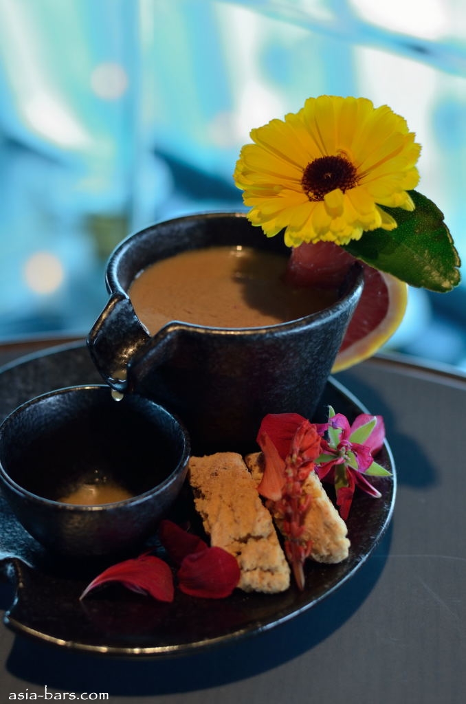 Amore Mio– Cognac, Cinar, homemade almond & Grand Marnier syrup, green tea bag, lime leaves and Grapefruit bitters, served with amaretto biscuit & a flower to nibble – from the bespoke AQUA LEGENDS cocktails
