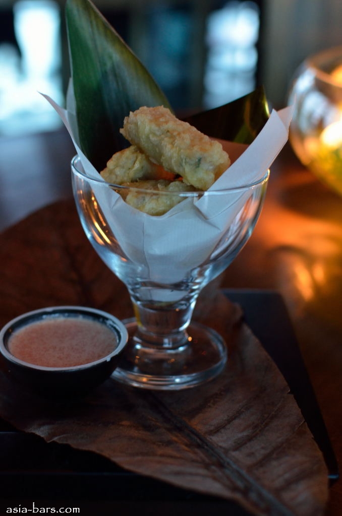 Minced angel prawn, lotus root and yuba bean curd skin rolls tempura with a spicy mayonnaise- from aqua spirit “Light Bites” menu