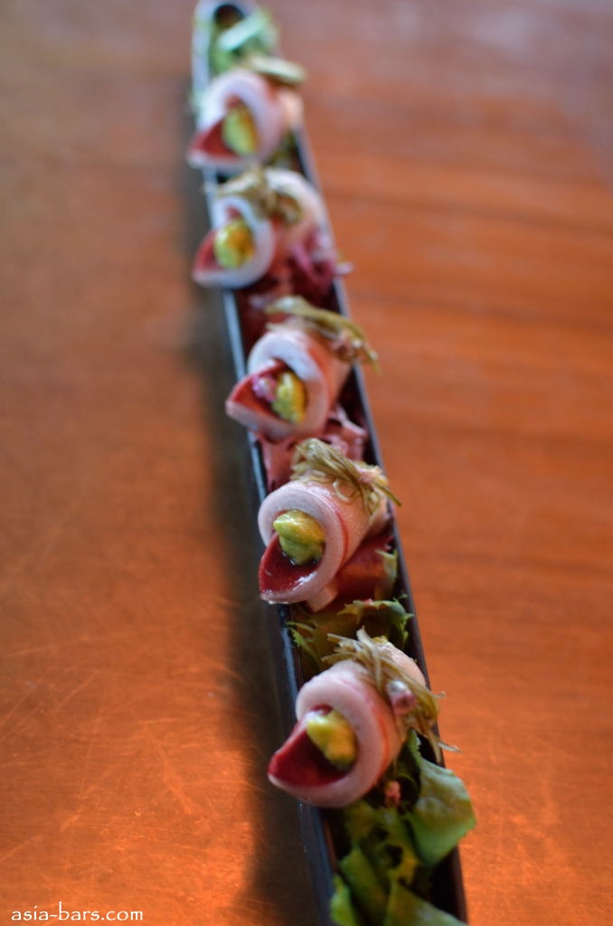 Yellow tail Konbu Tsuke style with avocado and ginger– from aqua spirit “Light Bites” menu