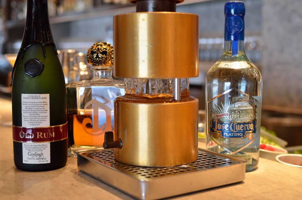 Deleon Tequila, Gosling’s Old Rum & Jose Cuervo Platino Tequila- all available exclusively in Hong Kong at Cafe Gray Deluxe- served straight-up with large, single ice-ball