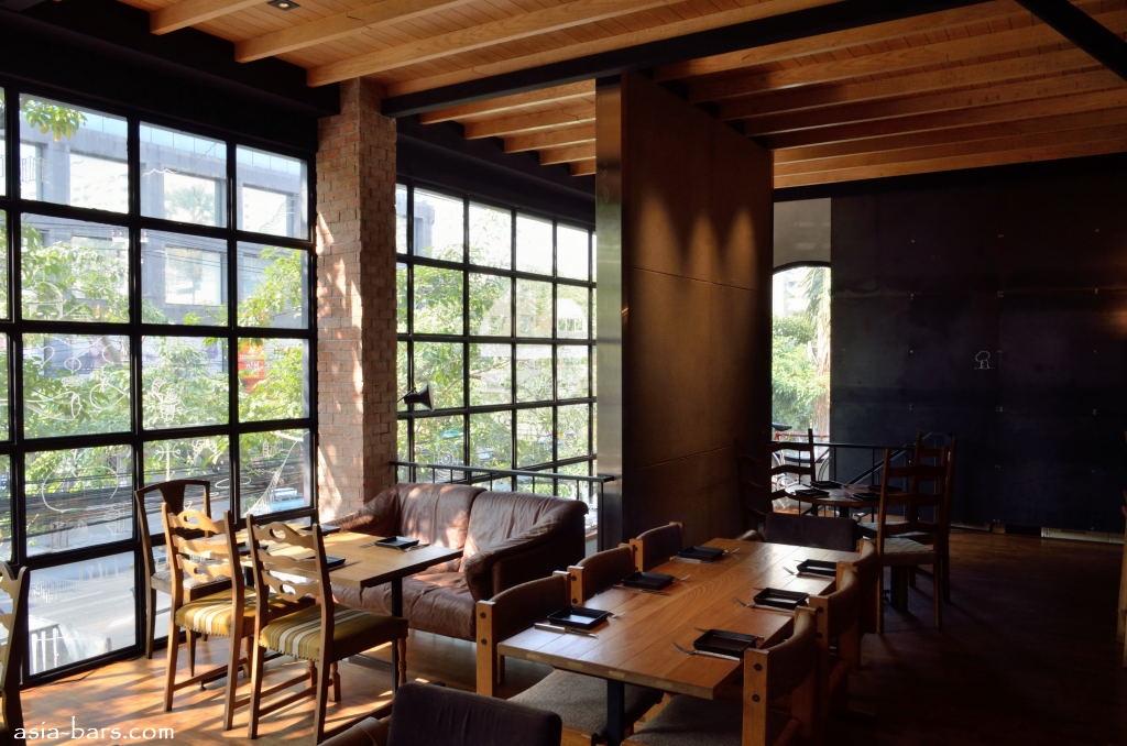 The design of Mellow embraces an industrial-chic style with a tempered palette of grey, black, blond timbers, and exposed brickwork. The external facade features full height walls of black, steel framed glass windows on two sides that bathe the interior with natural light and open up the internal spaces to the street life outside. The restaurant is entered via a heavy, industrial grade stainless steel door. Inside, the ground level features the main dining space that flows through to outdoor terrace tables, with the bar and kitchen at the opposite end of the room. A broad timber staircase leads to the upper level, where there are further dining tables, and an open-air balcony that overlooks the bustling Thonglor street.