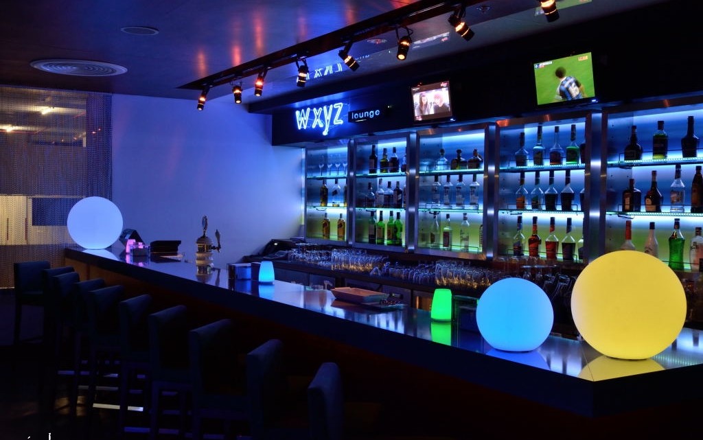 The bar counter and signature w xyz bar lighted back bar display that is found in w xyz bars at Aloft hotels world-wide