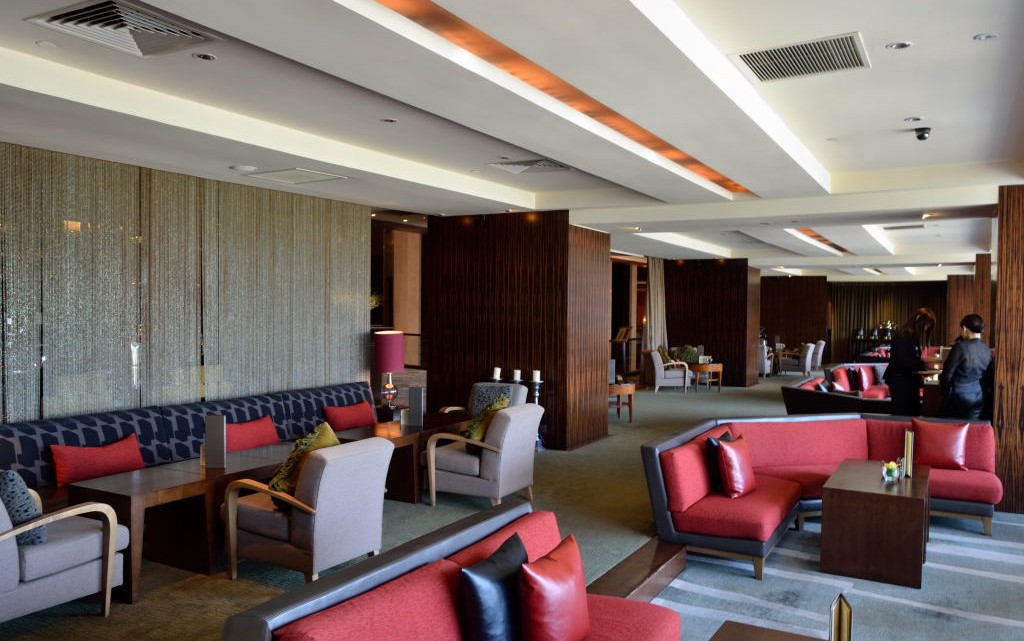 The contemporary lounge furnishings of Axis Bar & Lounge feature a bold colour palette of red, black and silver