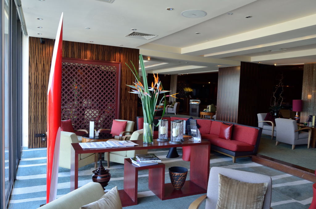 Lounge seating with views over Singapore skyline through the floor to ceiling glass windows