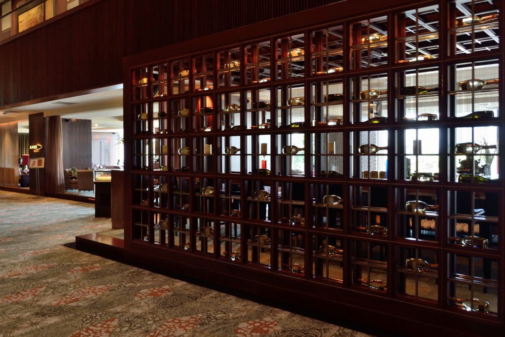 The internal facade of Axis features a rich timber display wall of vintage champagne bottles