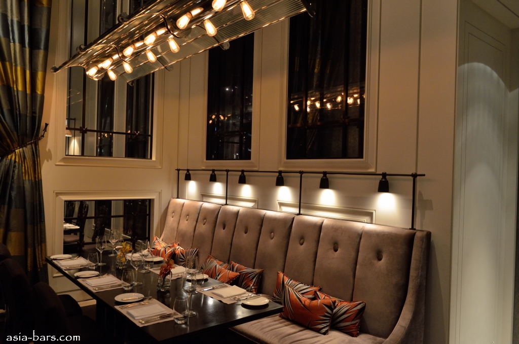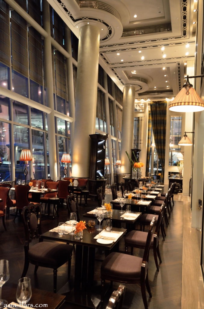 Clifford occupies an impressive space on the lobby level of the hotel- extending the full length of the building and facing out over Marina Bay. The moment of arrival is quite stunning- entering through the discrete doorway the soaring 10 metre high ceilings and full glass wall create a sense of spaciousness and grand scale. The interior design is the creation of renowned Hong Kong designer Andre Fu, who also created the concepts and designs for the other dining venues within The Fullerton Bay Hotel.