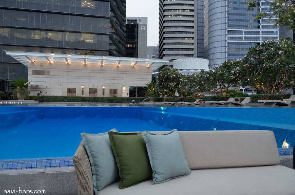 Located on the rooftop of The Fullerton Bay Hotel, on the waterfront of Singapore’s Marina Bay, Lantern is an eminently stylish combination of an outdoor bar and shimmering pool. Surrounded by luxuriant tropical greenery, the attractively landscaped rooftop setting provides a sanctuary of discrete luxury and relaxation on the edge of Singapore’s business district. The recently completed ( 2010) luxury boutique hotel was constructed on a podium extending out into Marina Bay, with the water on three sides of the low-rise structure creating a sense of separation from the adjacent busy metropolis.
