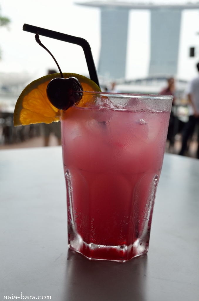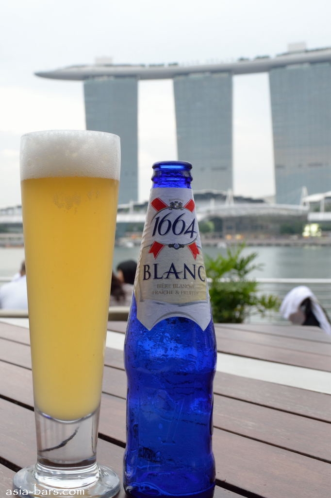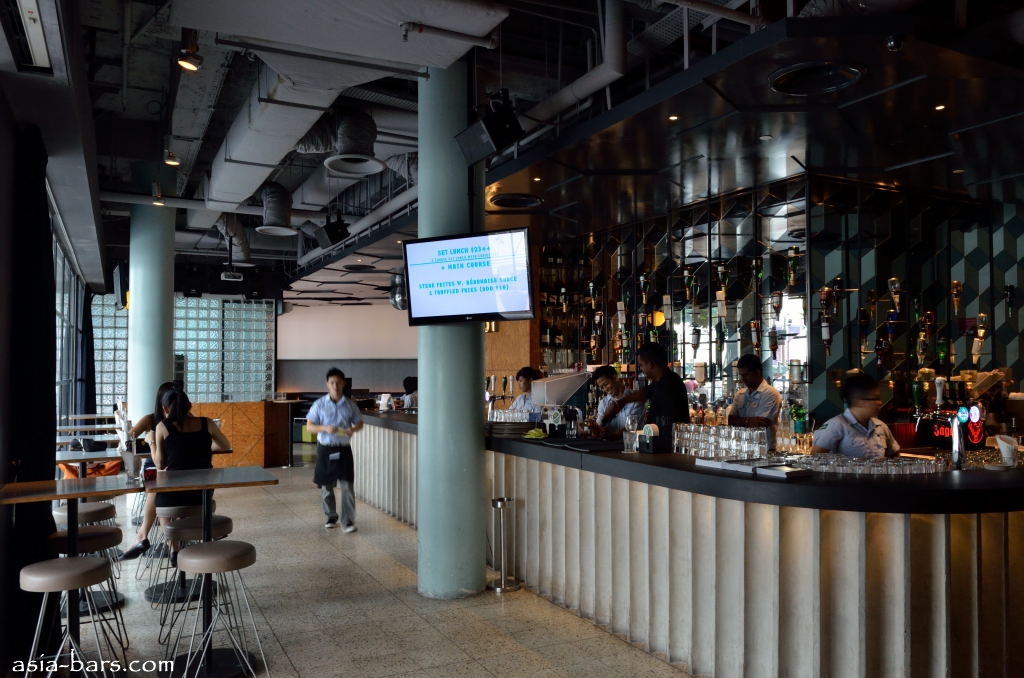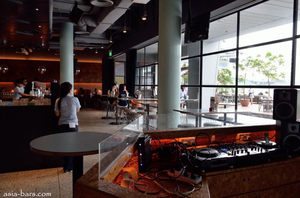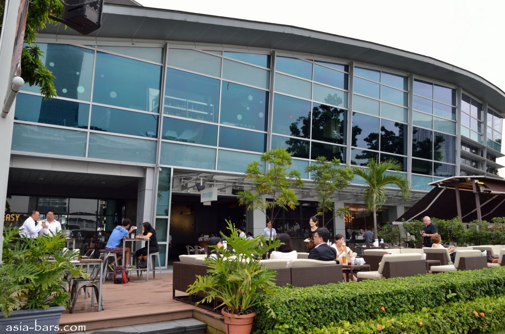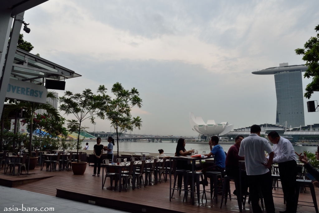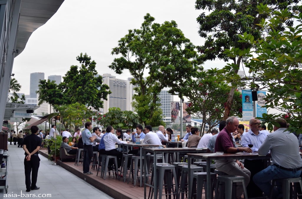 The outdoor timber deck extends the full length of the frontage onto the Marina Bay promenade. The terrace feature separate sections for lounging and chill-out in comfortable outdoor sofas and chairs; dining tables; and two sections of high bar tables and chairs for groups of drinkers- with the end section being a smoking zone. The sweeping views over the bay area are fantastic- and provide the best seats in town to watch the spectacular nightly laser-light shows emanating across the bay in front of the iconic Marina Bay Sands complex.