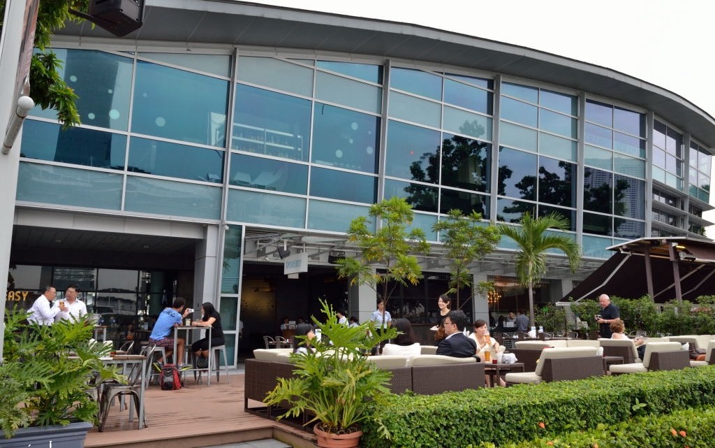 Open-air deck area in front of the One Fullerton building- with comfortable lounge seating