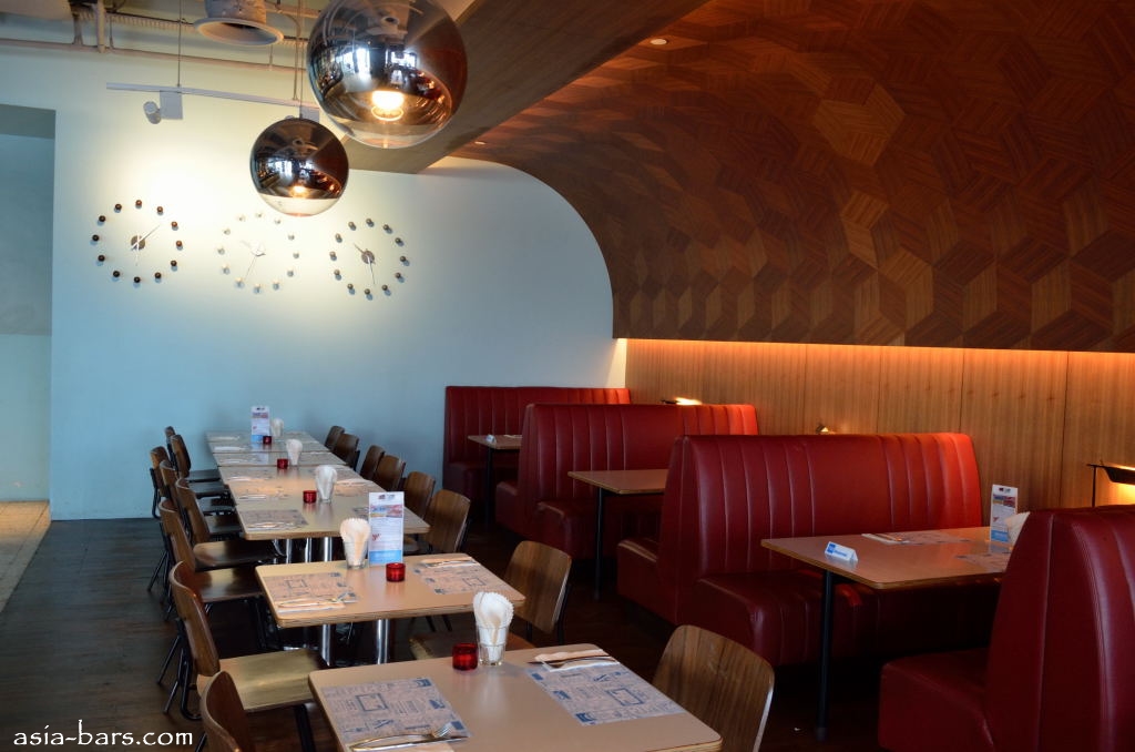 The interior design features a contemporary style, combining industrial chic with retro elements of the American diner. The dining area extends down one side of the room and features a row of red leather dining booths abutting the timber panelled wall. The main bar dominates the centre of the space- facing out towards the full height glass facade. And at the opposite end of the room is the DJ booth and an intimate adjoining lounge / dance floor area.