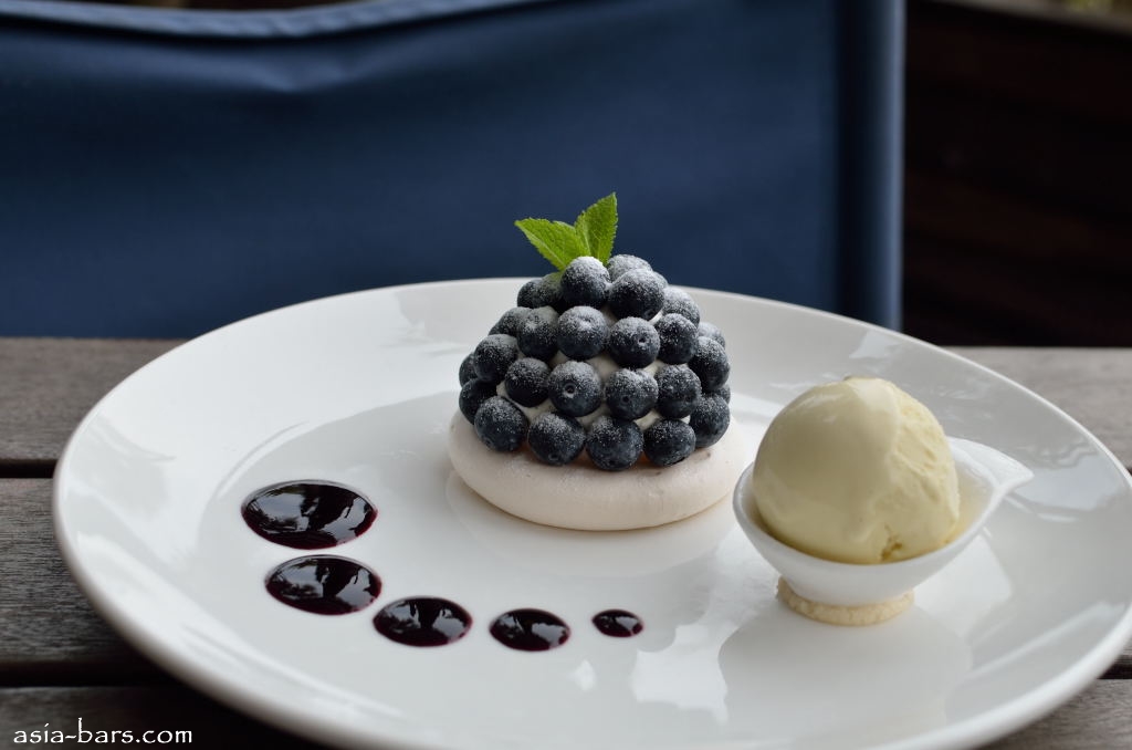 Blueberry Pavlova- crisp meringue, lemon curd, lemon-thyme ice cream