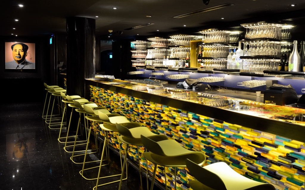 The bar in the Lounge is formed from randomly stacked multi-colored glass blocks that are back-lighted with dramatic effect. An original Andy Warhol image of Chairman Mao overlooks the bar area.
