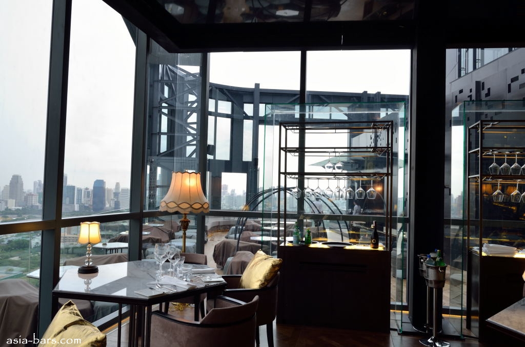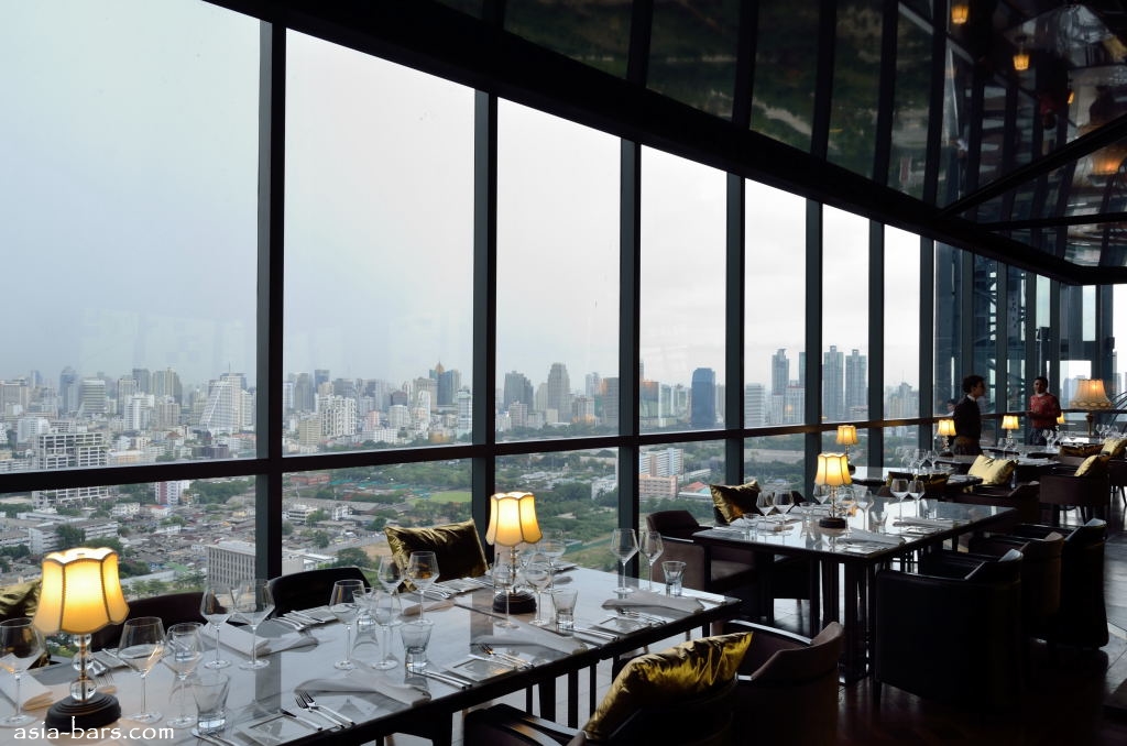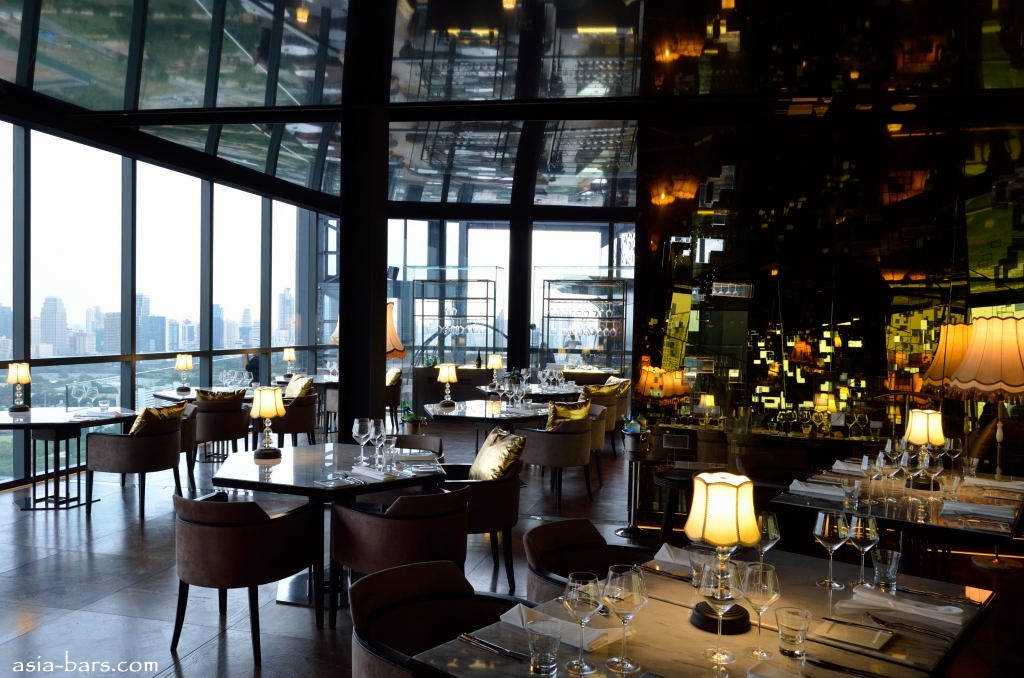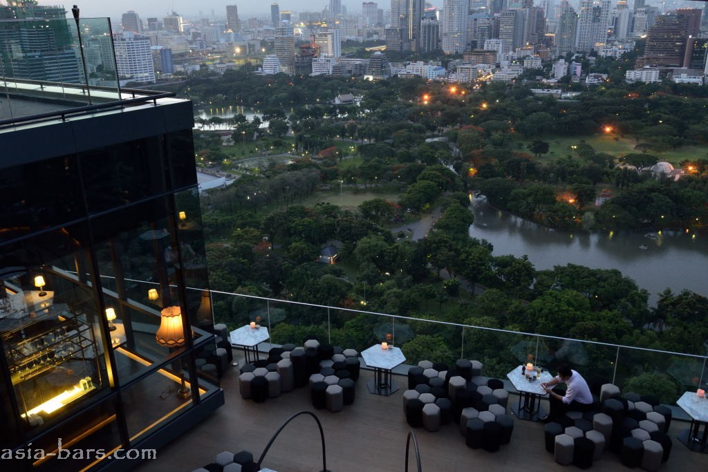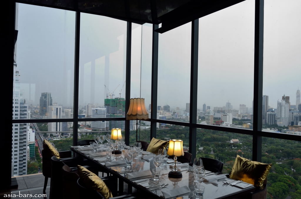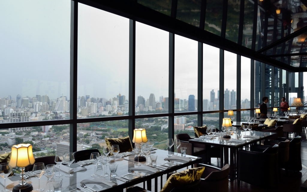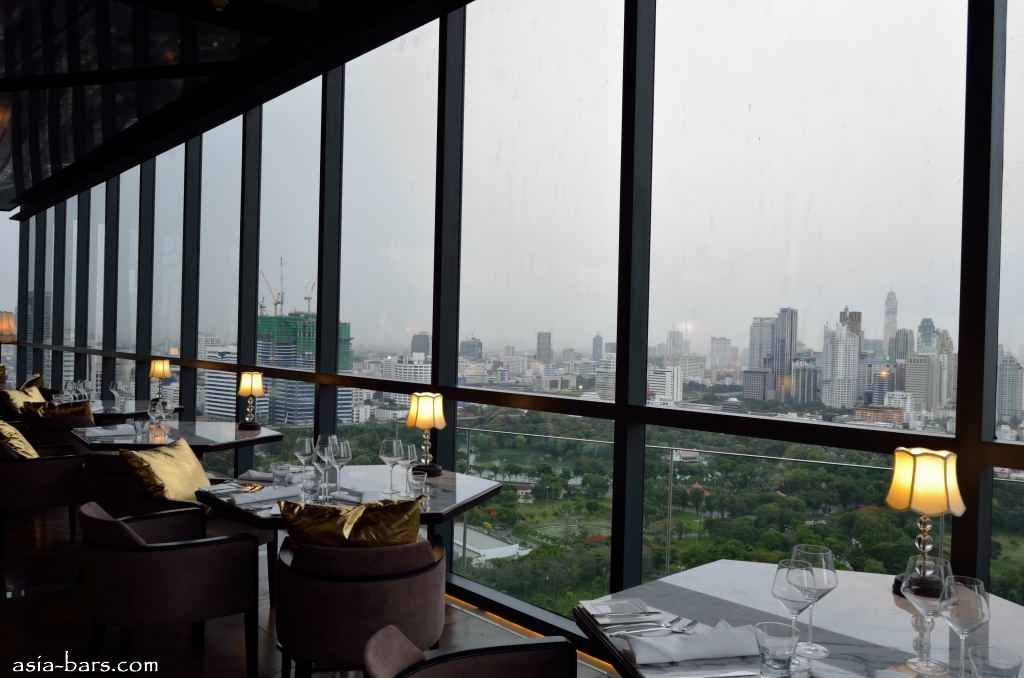 Window front tables present panoramic views over Lumpini Park and the urban skyline