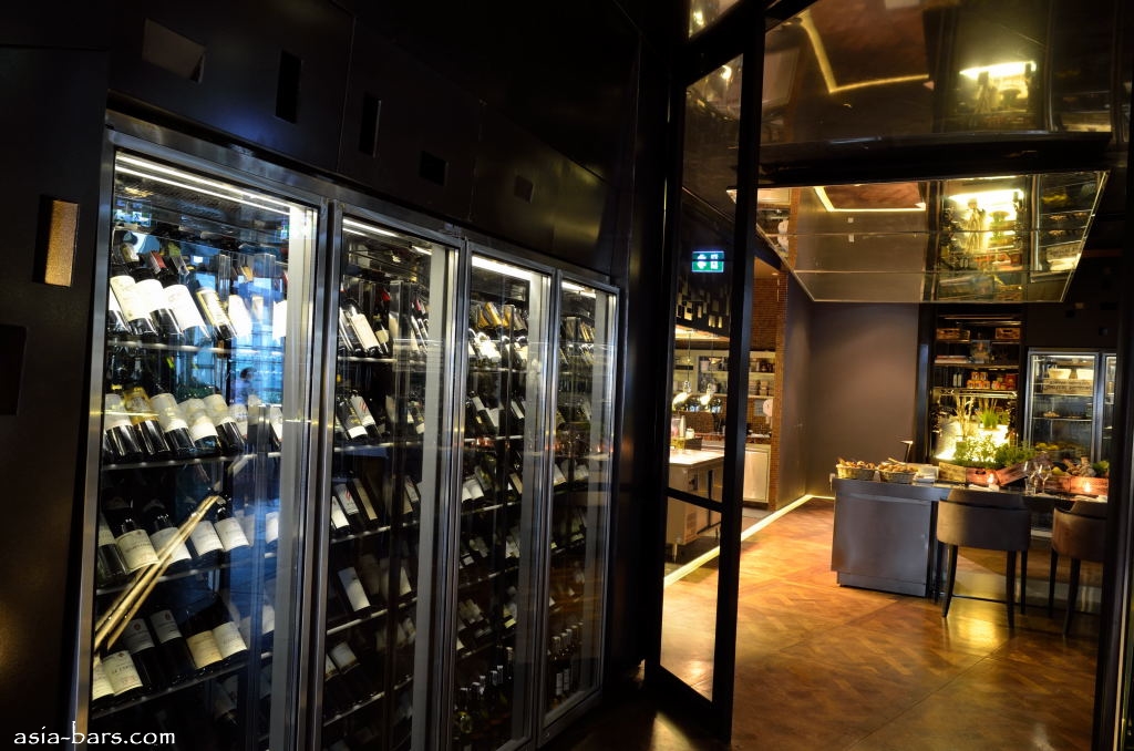 The moment of arrival at the 29th floor reception for Park Society entices guests with a sleek decor dominated by black mirrored surfaces. Sliding glass doors on one side lead to the outdoor terrace, and opposite, the passageway to the dining room takes a path leading past the glass fronted wine cellar, and subsequently, the gleaming showcase kitchen. The dining room is an intimately scaled space, enclosed by full height glass windows on three sides. Tables extend the full length of the glass facade providing diners with dress circle views over Lumpini Park. At one end of the room, a semi-private dining table stands in the corner space that protrudes out from the main building profile- almost floating above the street below.