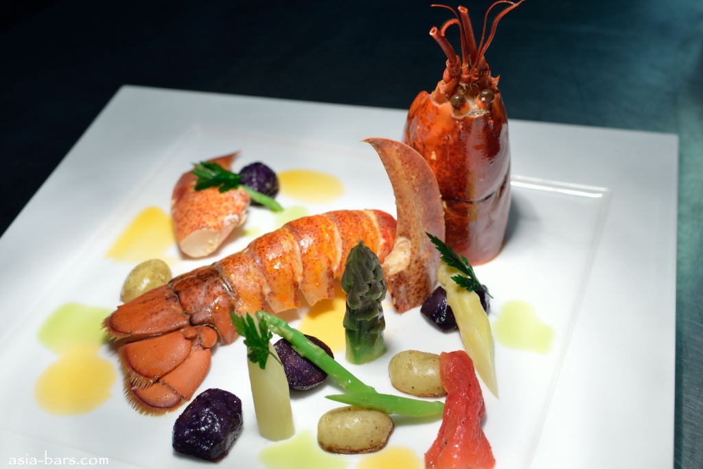 Lobster from Canada– Grilled whole lobster with asparagus, baby vegetable & bisque foam. Selection from the Fresh Daily Products menu.