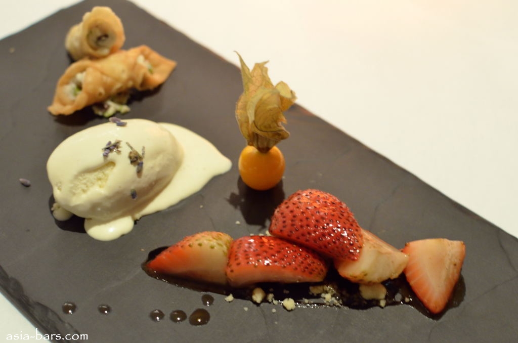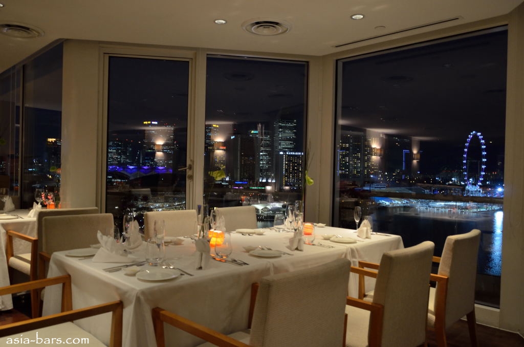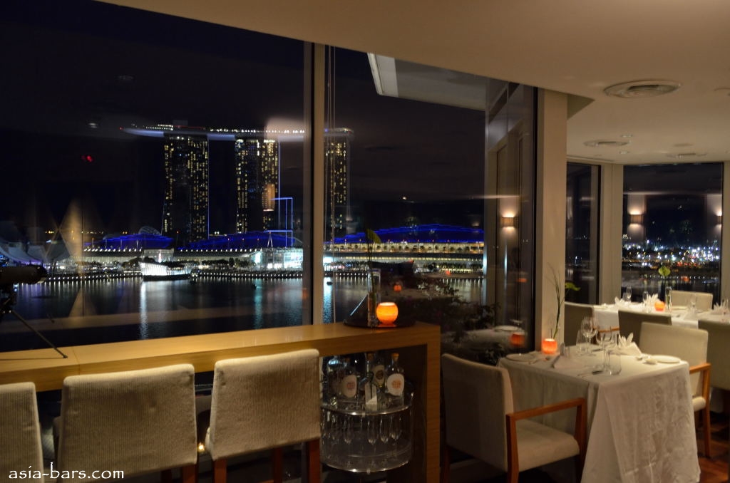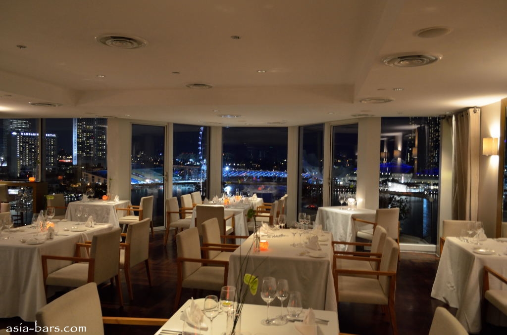 The restaurant has an intimate, cosy ambiance, with seating for only 52 diners in the single room. The full height windows spanning the front of the room provide all tables with breathtaking views across the entire Marina Bay precinct. Mirrored interior walls provide a further impression of spaciousness. The interior features an understated, contemporary decor that is simple and uncluttered in its elegance. A palette of mostly light colors- with classic crisp white linen table cloths, light timber chairs and white painted ceiling and walls keeps the attention on both the stunning views, and the memorable gastronomic experience.