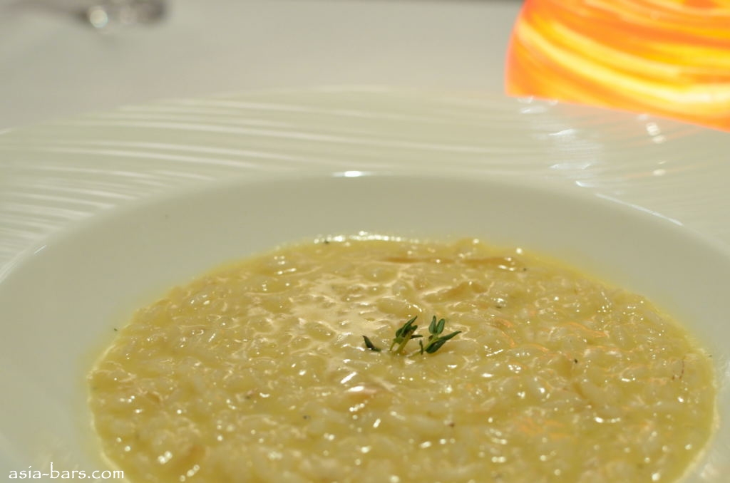 Il Risotto– Risotto cooked in Capon Consume, Caramelized Shallots, Fresh Thyme.