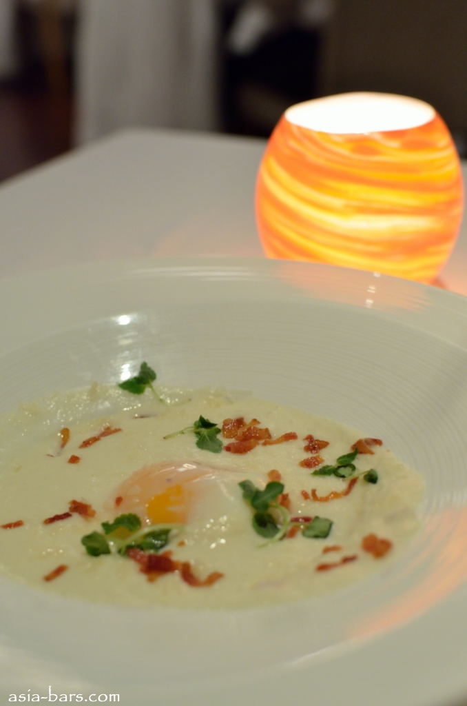 Soft poached Organic Egg with White Asparagus foam and crispy Pancetta