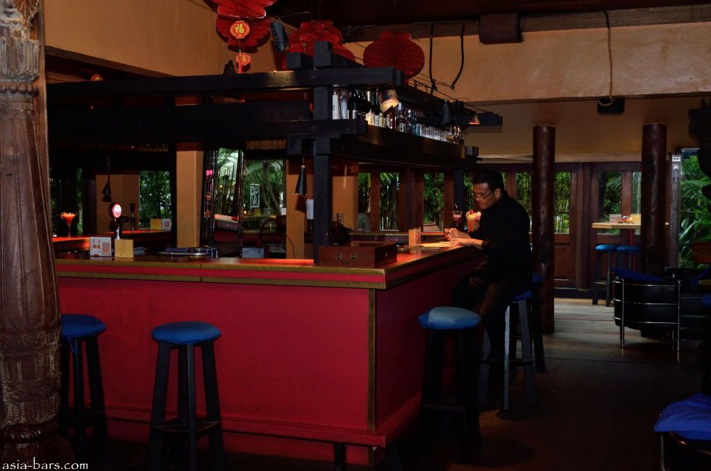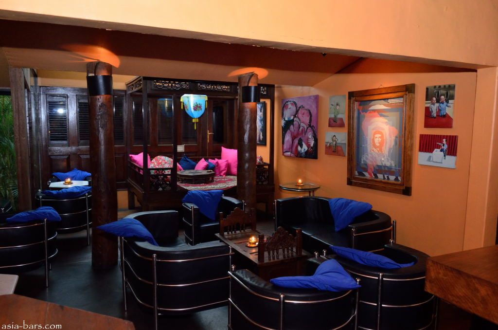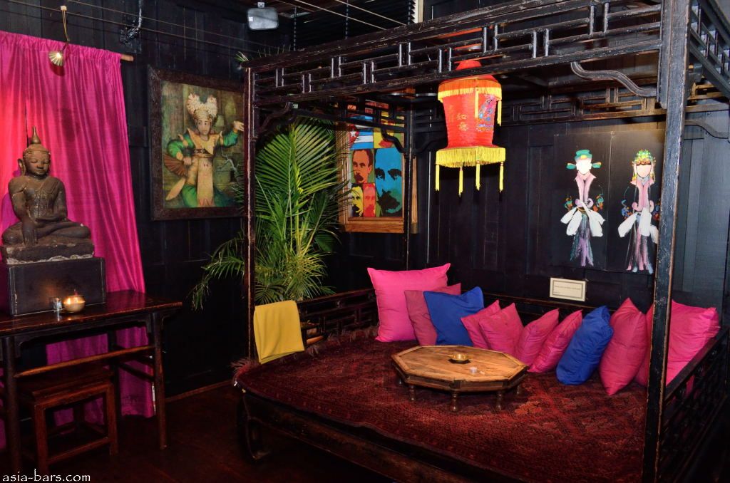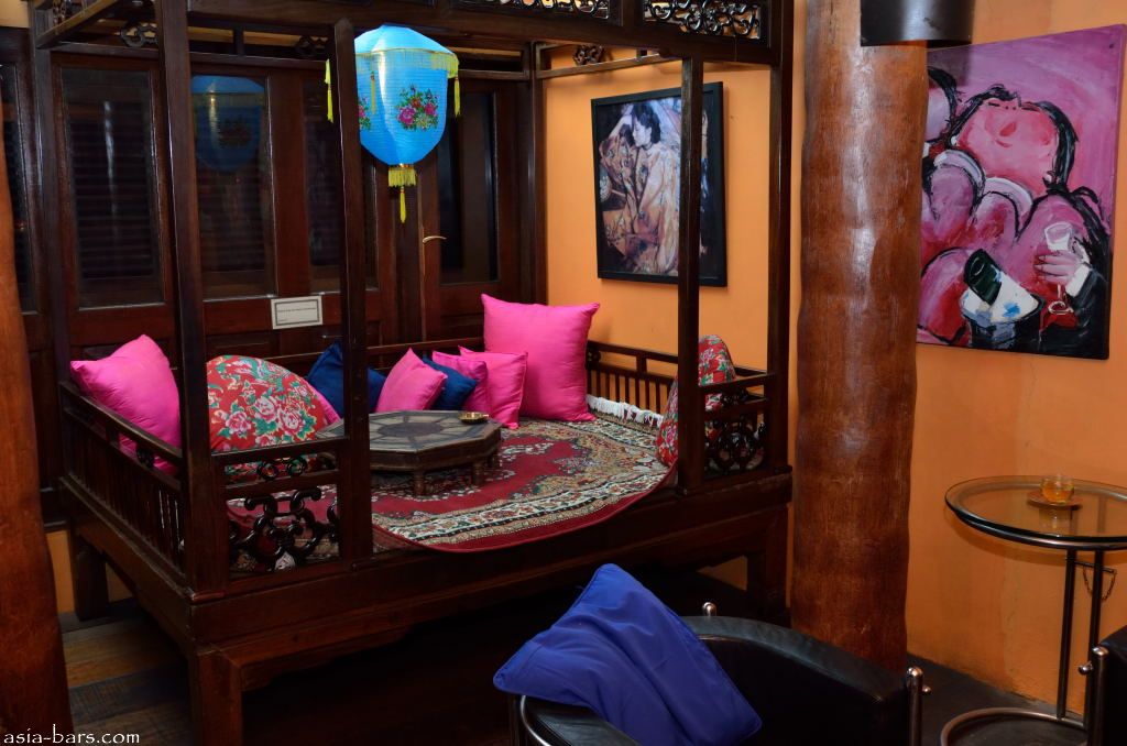 The spaces adjoining the bar are filled with an eclectic collection of furnishings, with antique Chinese beds sharing the space with contemporary furniture.
