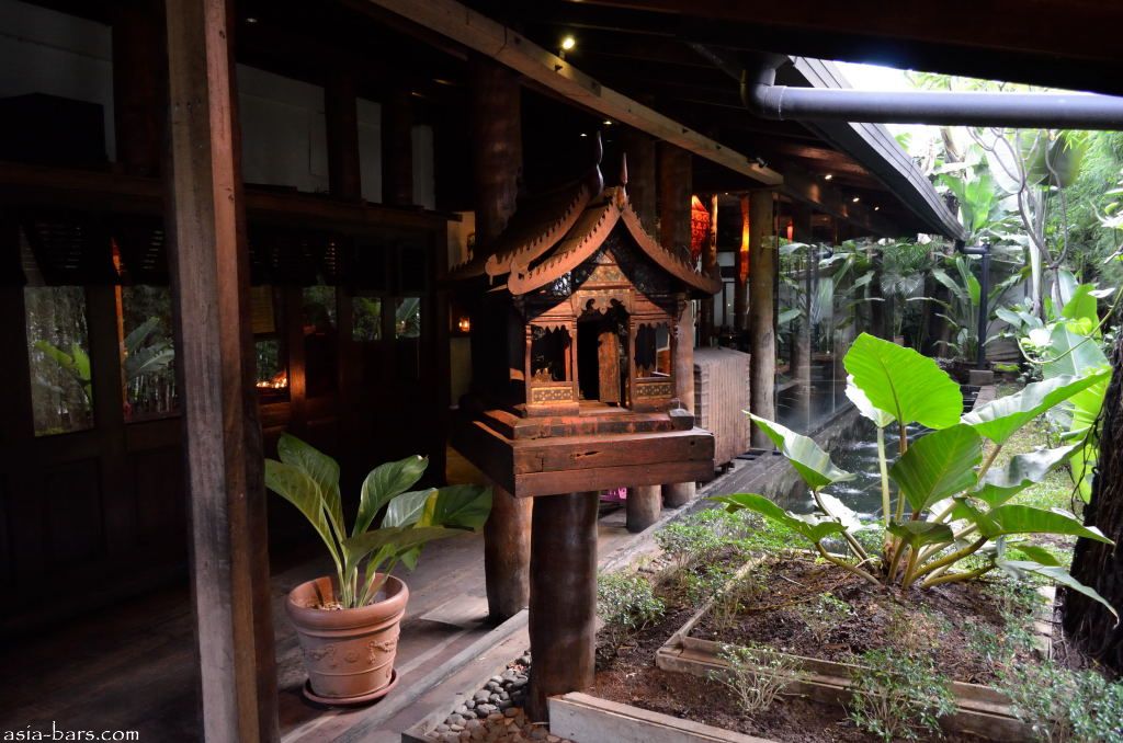 The entrance passageway with water ponds and garden. A carved timber spirit house is prominent.