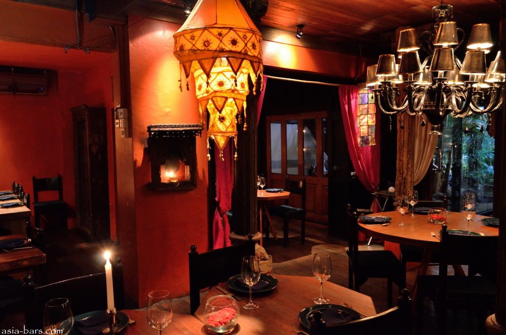 The main dining room of Hazara features authentic fabrics and artifacts from India