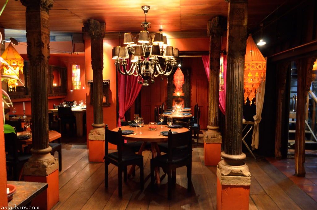 The Face Jakarta establishment occupies a restored two level building that has been extensively remodeled to recreate an authentic cultural environment. Raw timber beams and pillars, the original timber flooring and ceilings contrast with the internal walls rendered in bold colors. The sprawling floor plan follows the original rooms of the building, creating a variety of spaces within each section. The ground floor features the FACE Bar on one side of the entrance hallway, with the Hazara Indian restaurant occupying the spaces across the other side. A staircase leads to the upper level and the Lan Na Thai restaurant, which features a series of interconnected dining spaces extending across the entire width of the main building.