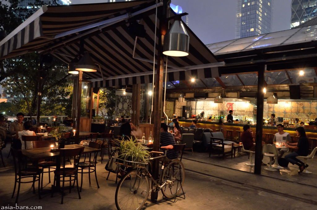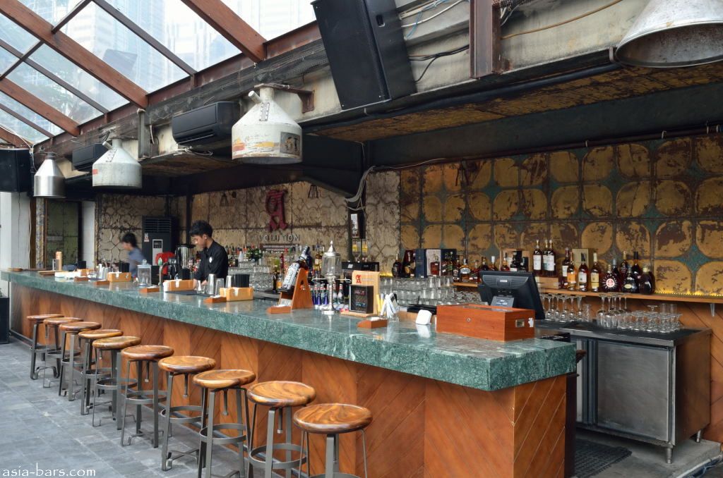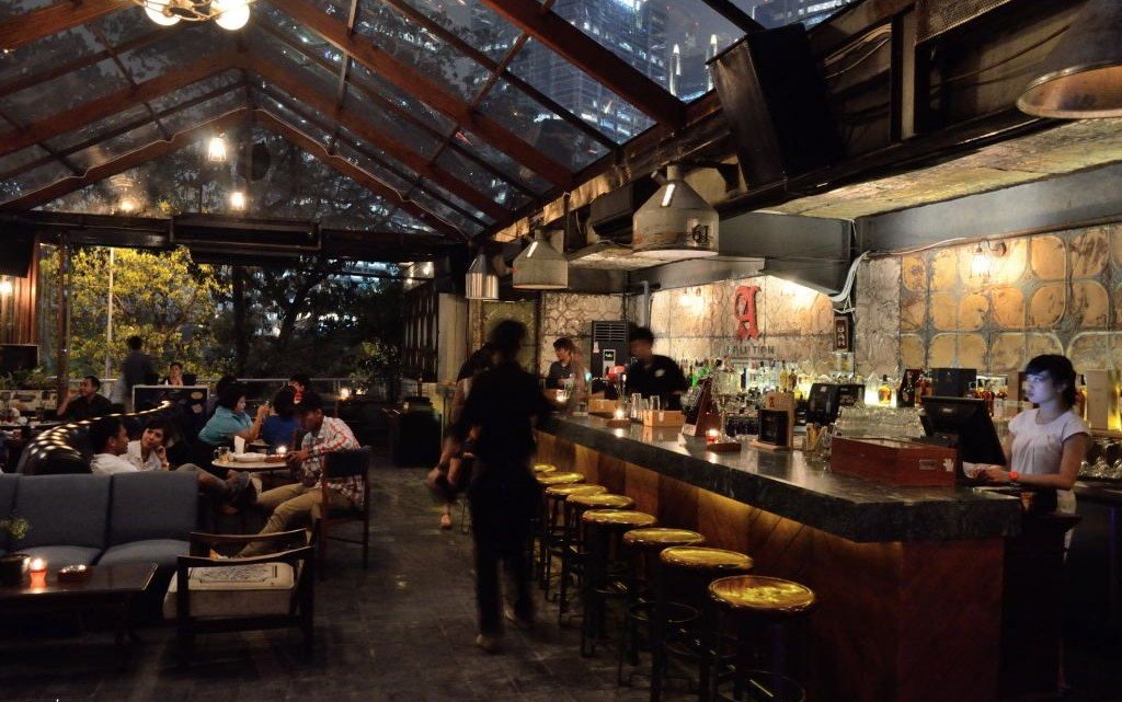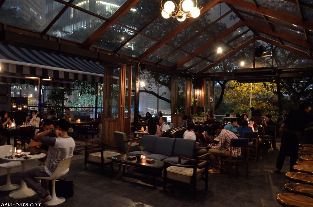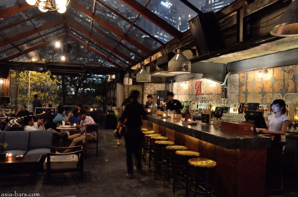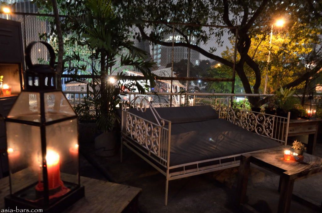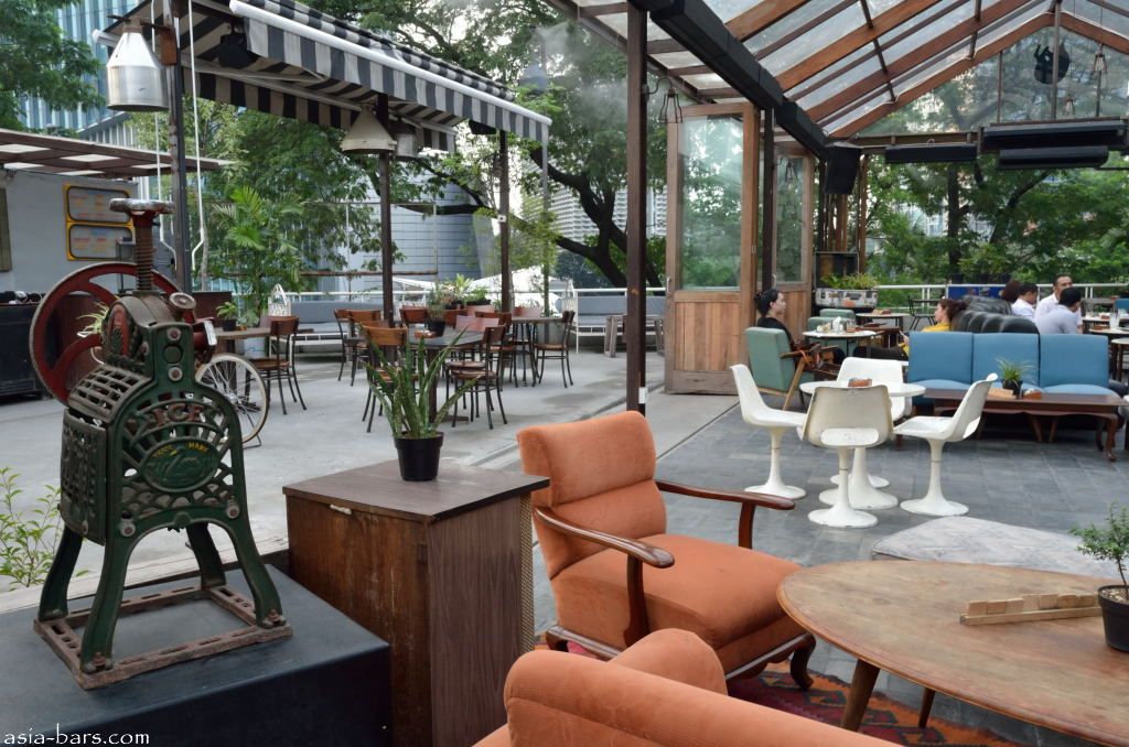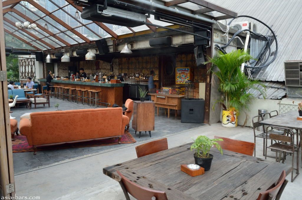The low-level rooftop setting for Lucy in the Sky gives the space a “tree top” outlook on the surrounding office towers of the SCBD business zone. The rooftop is completely open air except for a glass topped, pitched-roof construction that houses the bar, kitchen and lounge space. Across the large open, concrete paved terrace areas are a series of table settings with large extendable awnings set into metal frames for protection from rain. The outdoor furniture consists mostly of rudimentary tables of recycled wood, with metal frame and timber chairs. A number of old wrought iron day beds are placed under the trees at one end for the more intimate relaxation. Under the glass roofed section, furniture ranges from retro molded plastic chairs and tables, to 60’s style sofas and fabric upholstered chairs, and with a long curving, double sided banquette extending down the middle of the space.
