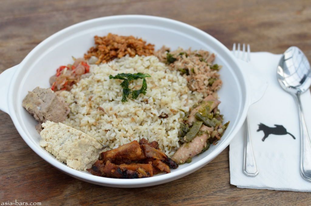 Nasi Jeruk – a mixed fragrant rice based on orange leaves & herbs, served with pepes tahu (tofu), kering tempe ( dried soya), salty fish, grilled chicken and sambal matah ( raw spicy paste )