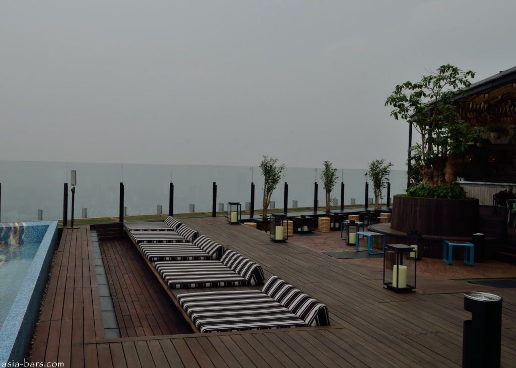 Poolside daybeds set into the timber decking ( on an overcast & very hazy afternoon!)