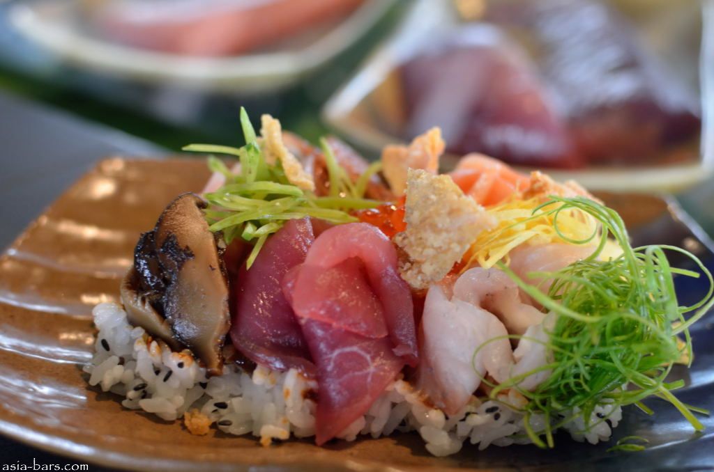 Scattered Sushi- Sushi Rice, Hamachi, Tuna,Salmon, Shima Aji, Eel, salmon roe, Egg, Sushi Rice, Black sesame, snow pea,Shitake mushroom, salmon skin.