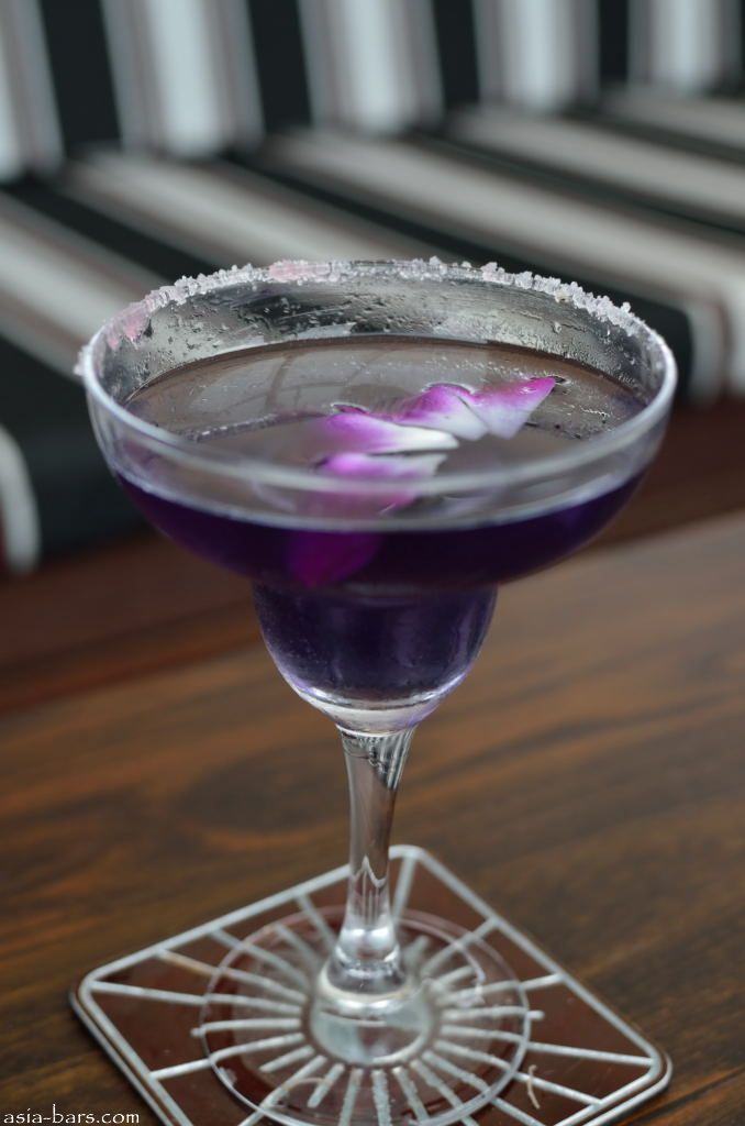 Violet Margarita- Jose Cuervo, violet liqueur bitter truth, lemon juice berry, violet teisseire. Garnish half rim with violet teisseire, salt, orchid flower