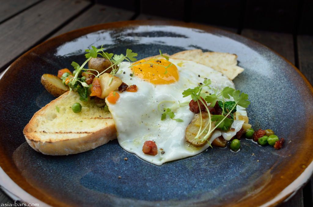 Bubble ‘n Squeak- Chorizo, potato, pumkin, peas, spinach, cherry tomato and fried egg