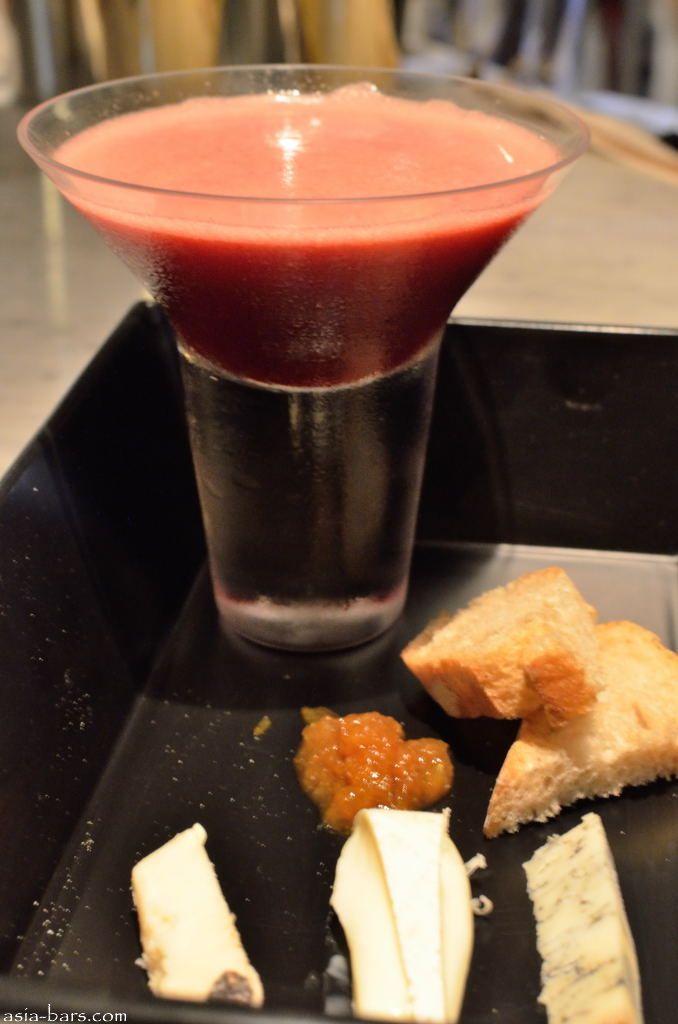Morello Cherries Campari Apertivo– Bitter Campari shaken with Maraschino, Morello cherries puree, Pama, and Pomegranate juice, served with cheese tasting and home made orange marmalade.