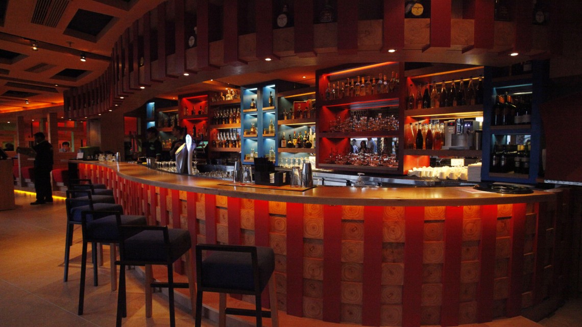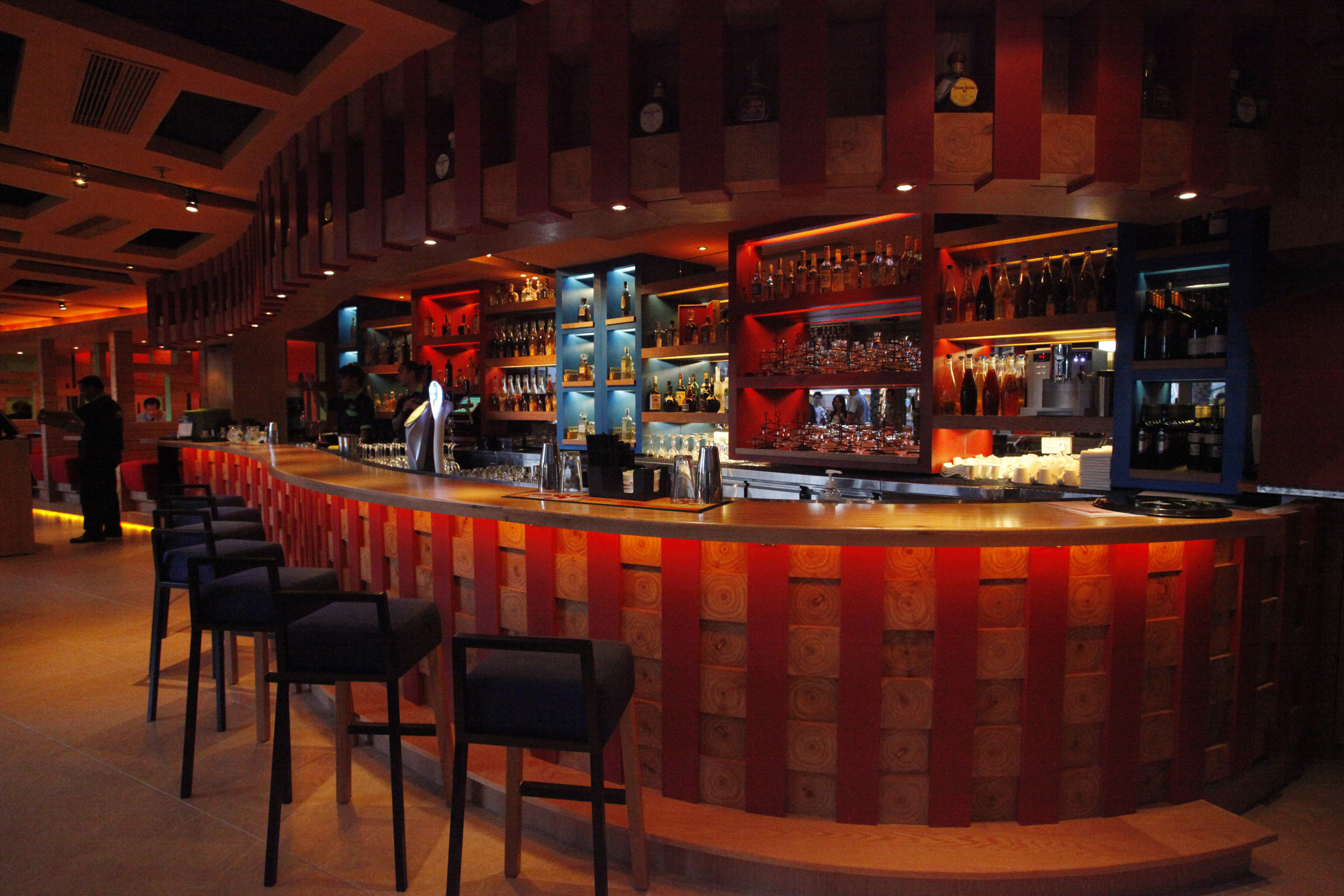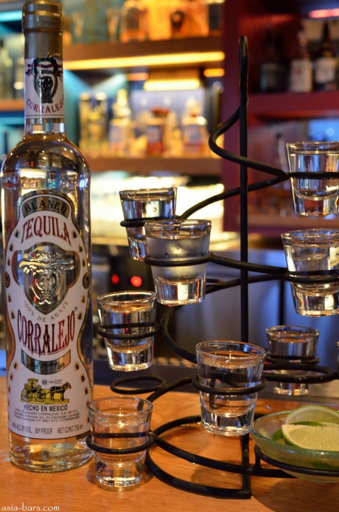 The main bar counter and wall of tequila bottles