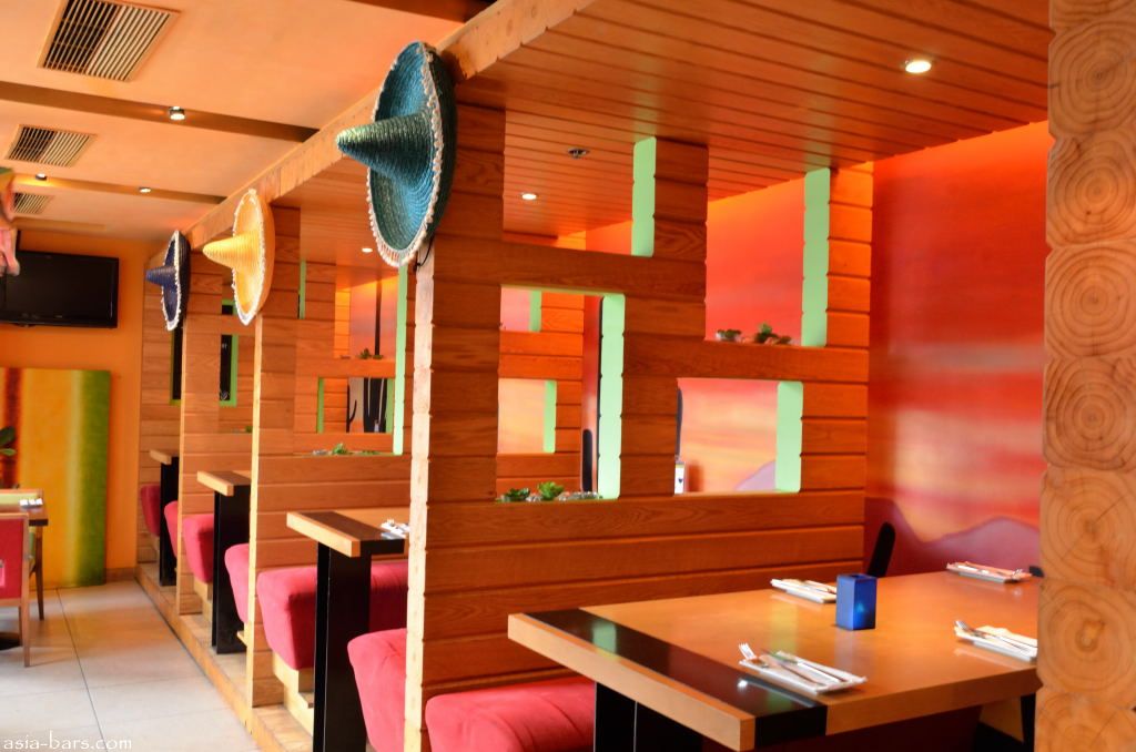 The vibrant colors of the interior dining booths evoke the Mexican theme
