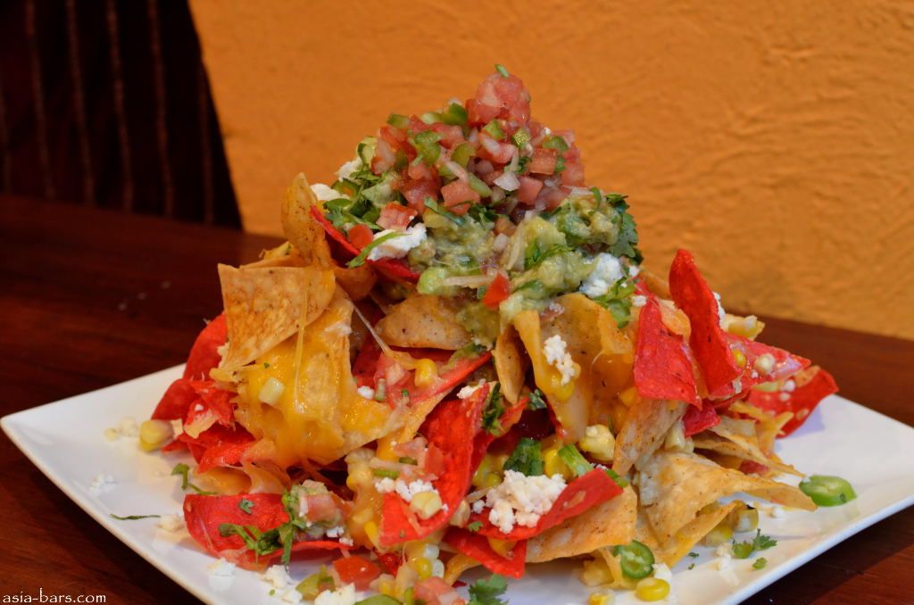 Nachos – tortilla chips layered with melted Asadero cheese, roasted corn, peppers, salsa and guacamole