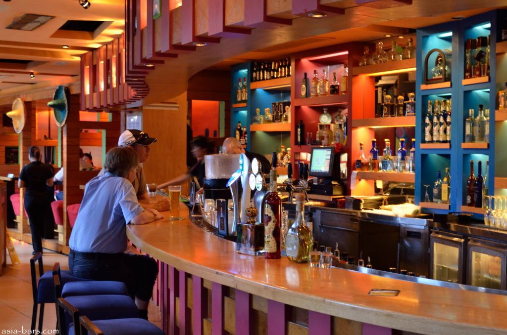 The interior design of Cafe Iguana takes its cue from the vibrant colors usually associated with anything Mexican- the palette of bright orange, red, lime green blends with the softer tones of the blond timber furniture and bar counter. The long curving bar dominates the interior space, with the back wall showcasing the extensive range of premium tequila bottles. Brightly decorated booths extend along the back wall adjacent to the bar, and a series of solid timber high tables with bar stools, and smaller dining tables, are arranged both inside, and on the outdoor terrace area. The total capacity is not large -with about 70 seats available for diners