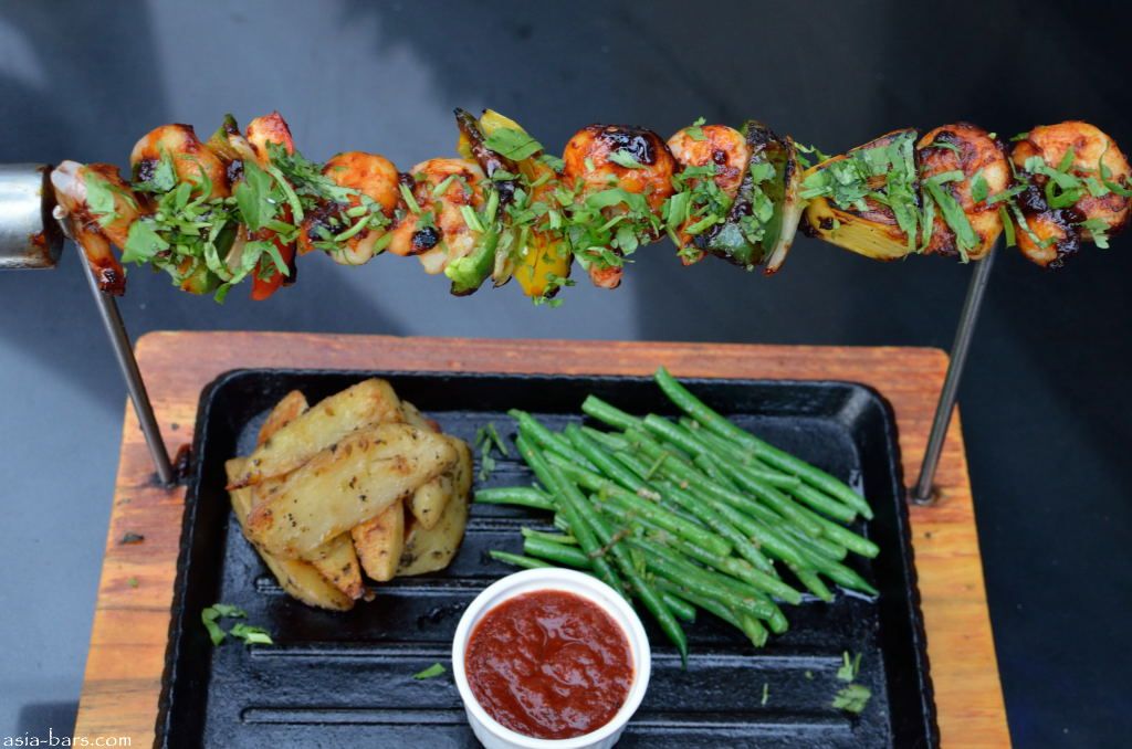 Alambre al Pastor – grilled skewers of shrimp marinated in ancho chili, pineapple juice, honey and spices, “al-pastor” style served with roasted lime-oregano potatoes (also can be served with pork or chicken)