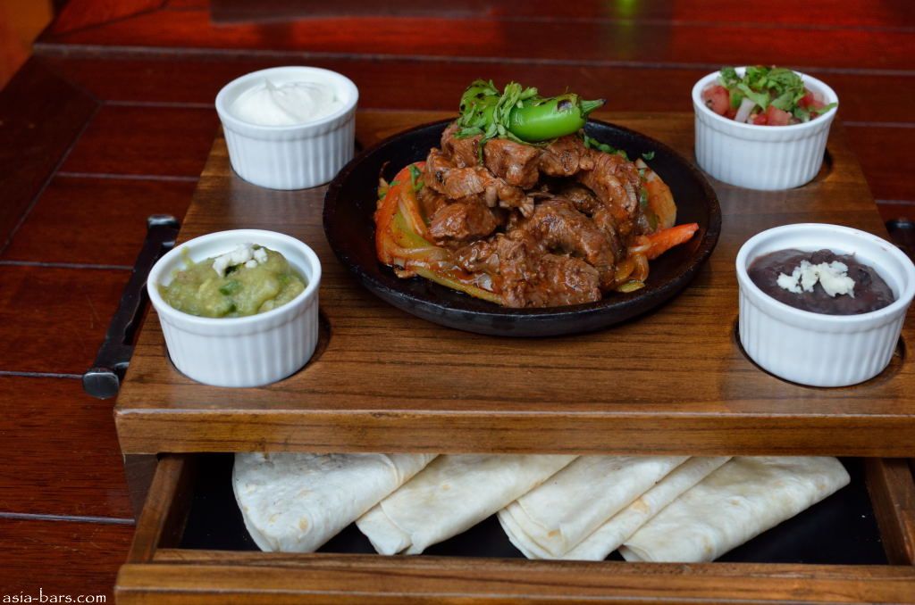 The Food Menu includes Snacks and Appetizers for sharing- including Guacamoles; Nachos; Chorizo Frito; and Chili Prawn Tacos. Main dish specialties include- Fajitas; Burrito de Cerdo; Hamburguesa Mexicana– prime beef burger with grilled pineapple, roasted corn, jalapeno salsa and skin fries.