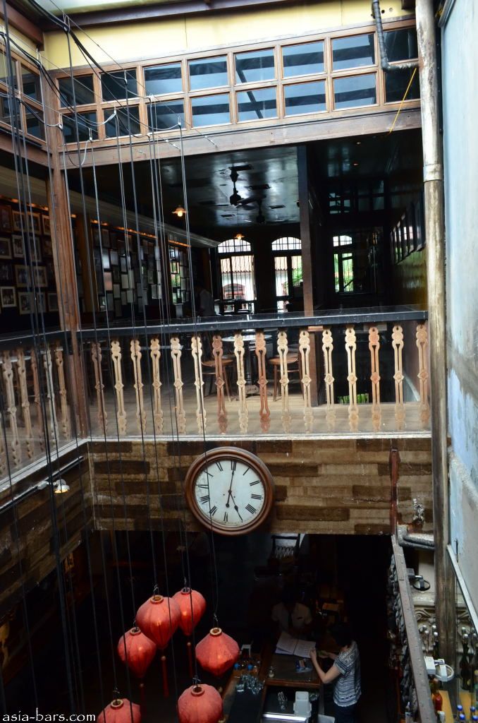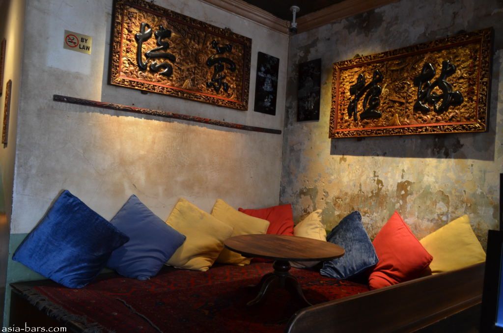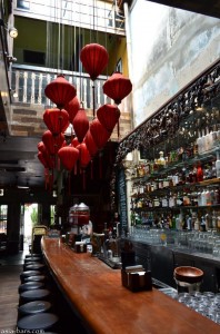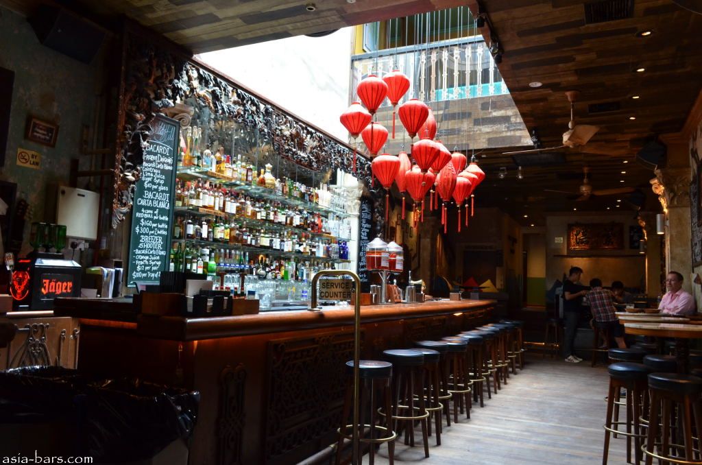 The centre-piece of the room is the striking main bar mirrored display wall, framed by a massive antique carved wooden arch. Overhead in the light-well red Chinese lanterns are suspended from the upper ceiling- in exactly the same manner as when the bar first opened 20+ years ago.