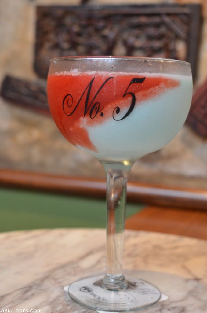 No. 5 COCKTAIL- The famous signature cocktail. Served in a huge, over-size glass more than 14cm in diameter. Prepared in two separate parts- red & green- and carefully poured to create the split colour effect. Blended with ice for a thick consistency, ingredients include Rum, Vodka, pineapple juice, mango juice, coconut cream & syrup, strawberry puree, Bols Blue Caracao, & Creme de Banana.