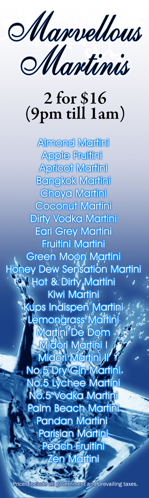 Happy Hours: Weekdays- 12:00pm ~ 9:00pm ; followed by Martini Specials from 9:00 pm ~ 1:00 am – with two martinis for S$16