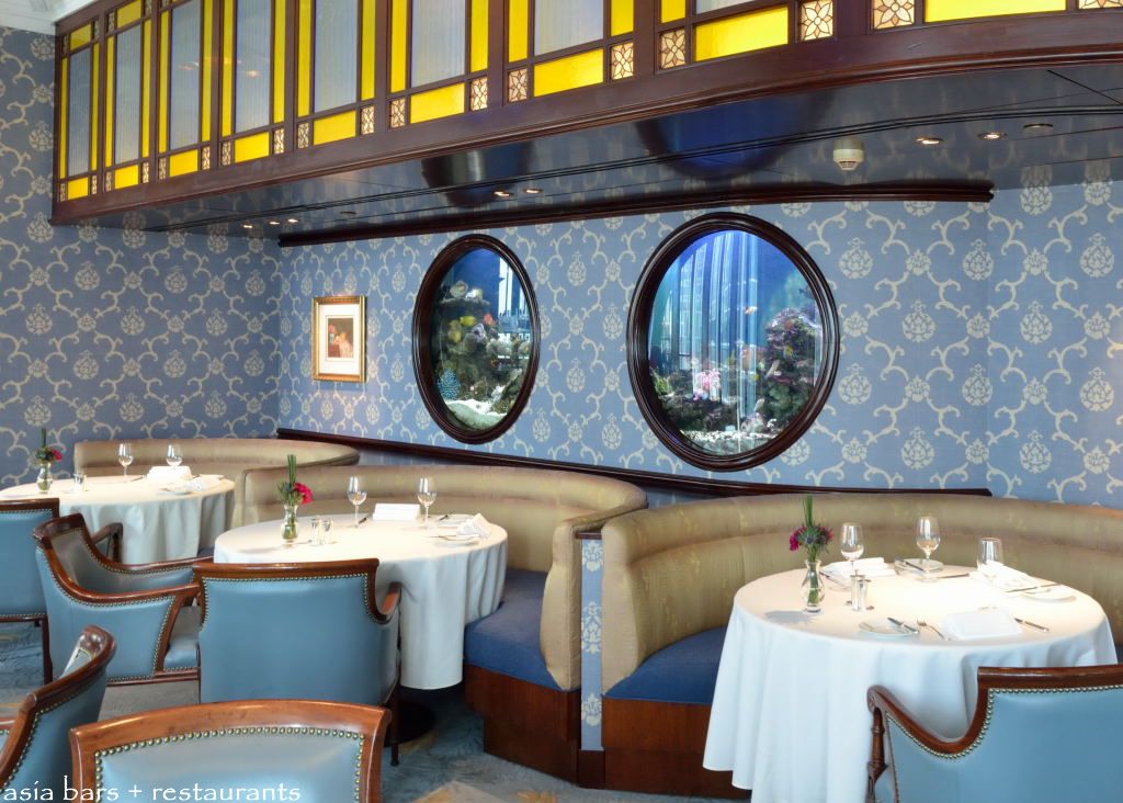 Section of the dining room with curved banquette seating, and with oversize “portholes” that look into tropical aquariums