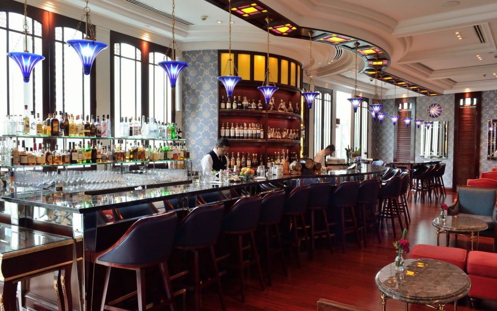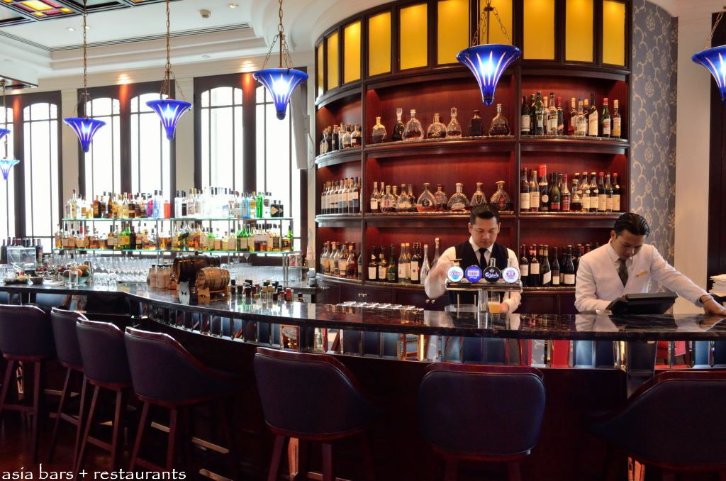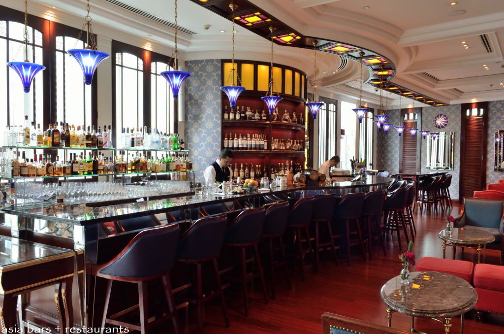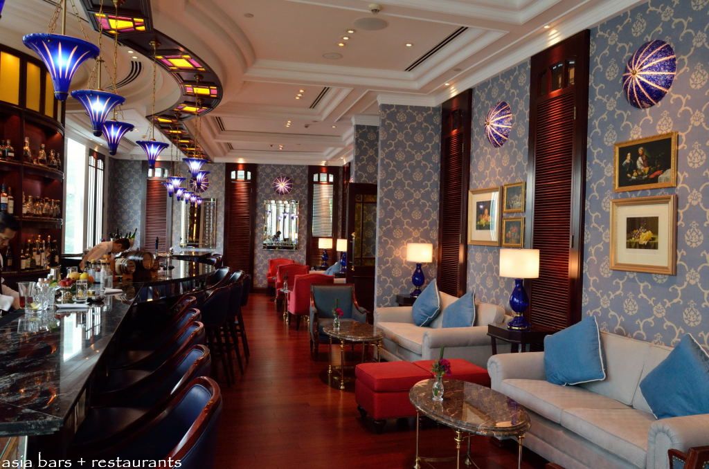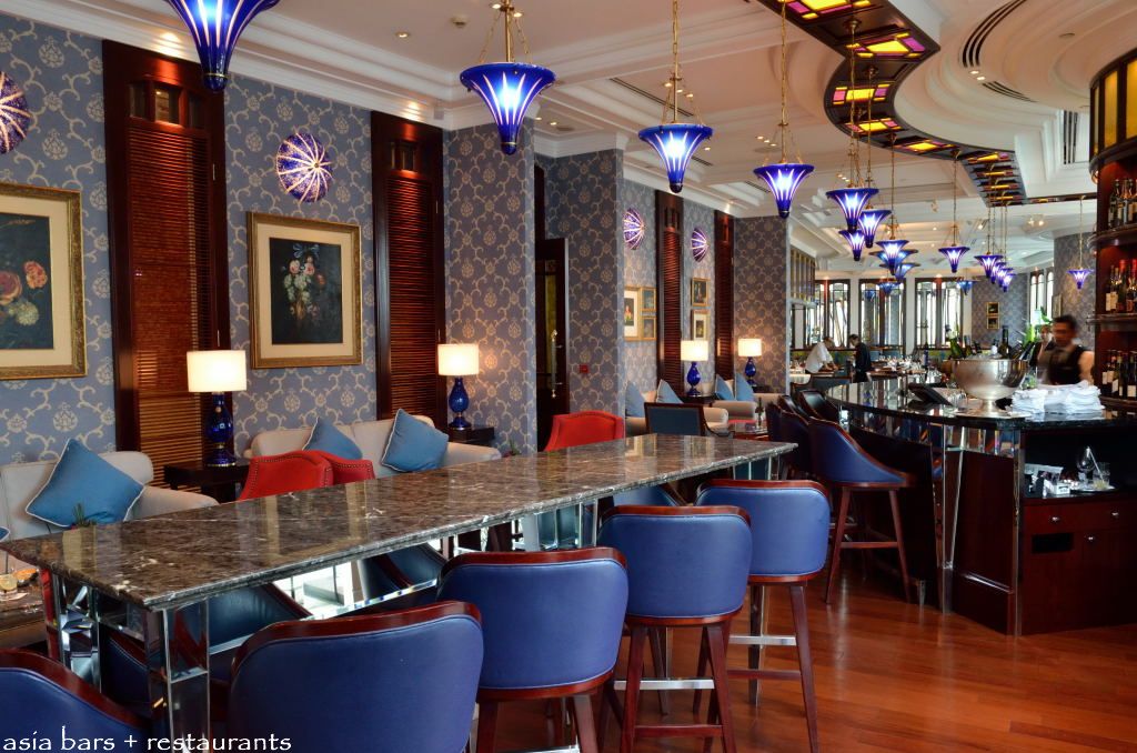 In the bar section, the impressive long, curving bar counter is fashioned from mahogany and topped with black marble. Mahogany framed bar stools, plushly upholstered with a vibrant blue leather, line the length of the bar, inviting patrons to settle in and soak up the atmosphere at the bar, and interact with the bartenders whilst devouring their drinks. Comfortable fabric covered sofas are arranged along the facing wall, beckoning a more laid back setting for socialising with friends.