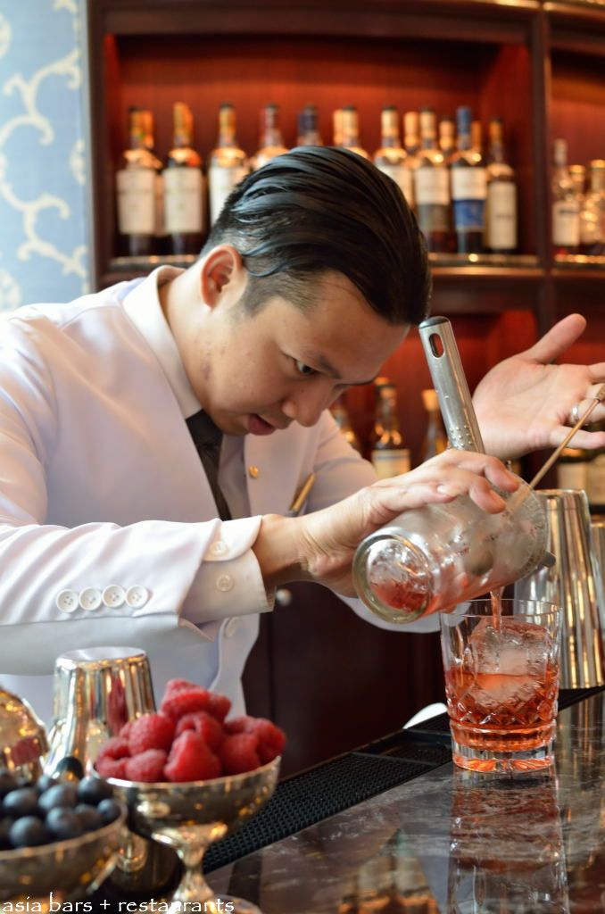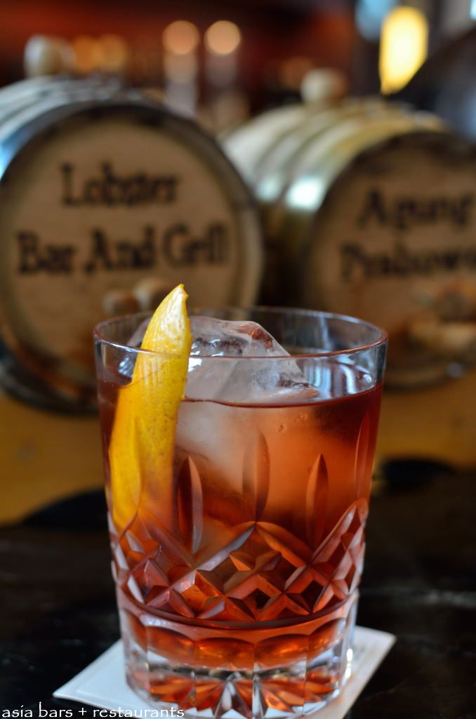 Bar Manager and head mixologist Agung Prabowo preparing the Sherry Oak Barrel Negroni.