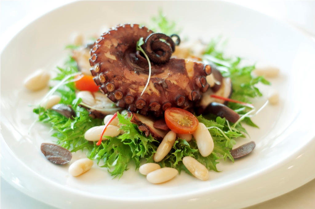 Grilled Pulpo – with Kalamata olives, soft white beans, orange bits, frelise, chili strings, sweet sesame orange vinaigrette.