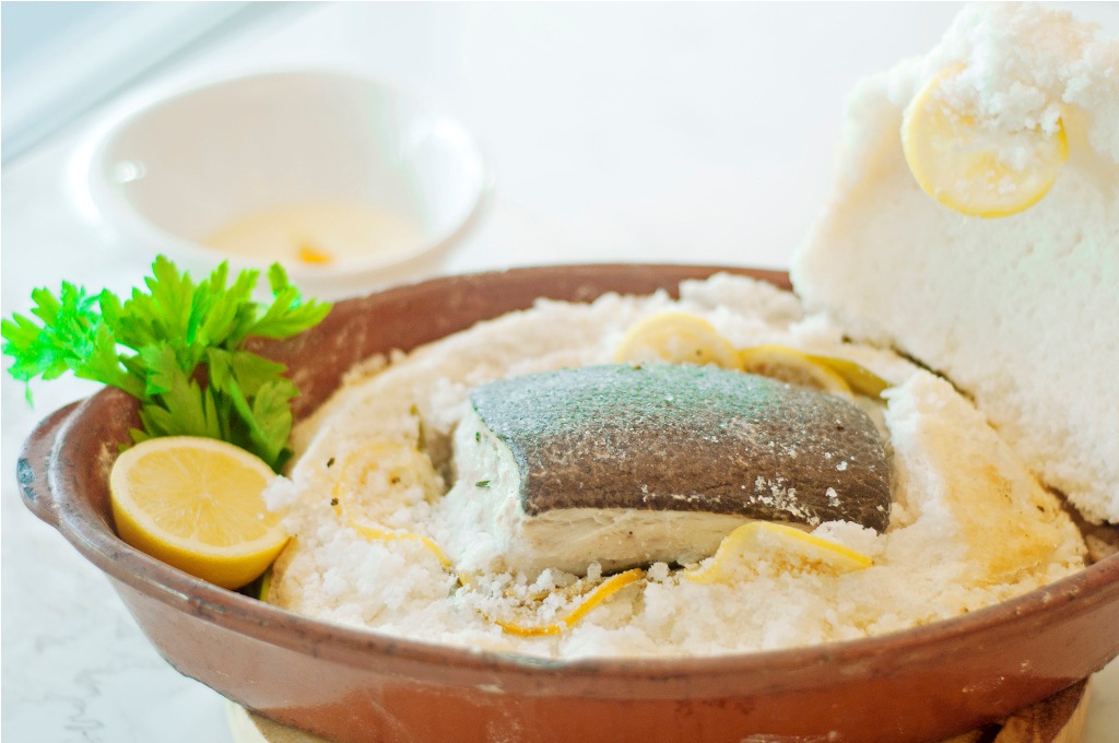 Salt Baked Gindara Fillet- with light dill-citrus cream, citrus bits.