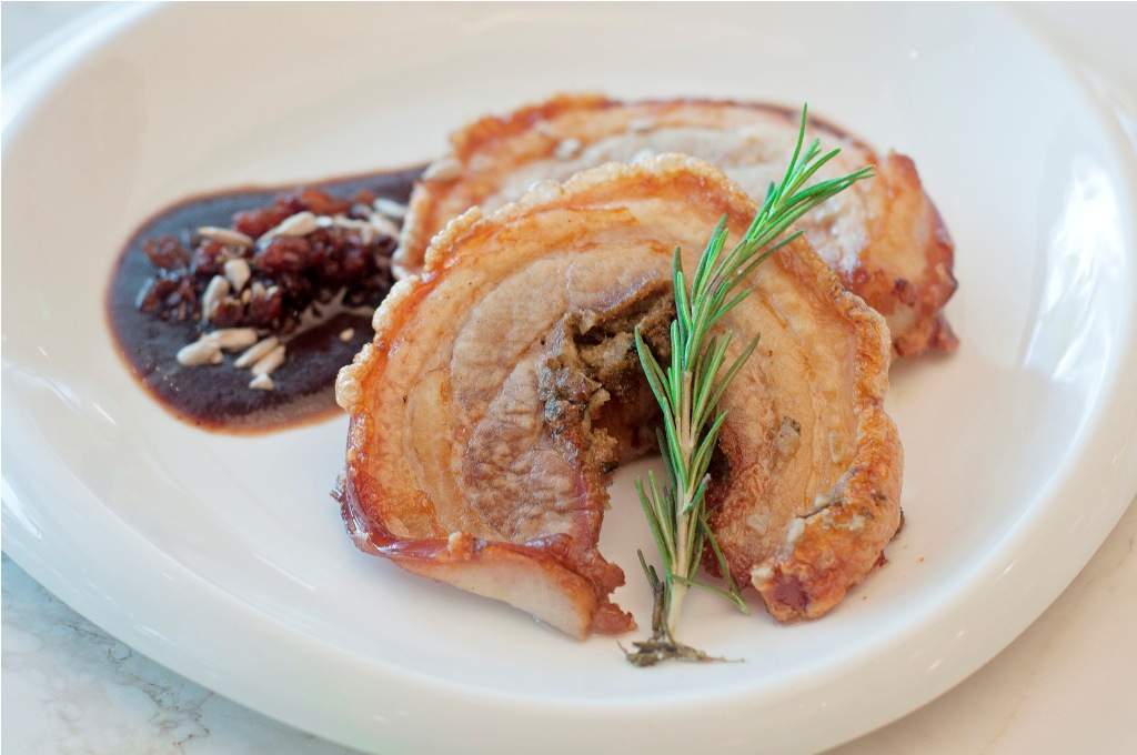 Stella’s Porchetta- Pork Belly Roll stuffed with double smoked bacon, fennel, herbs, served with warm rosemary sultana sauce.