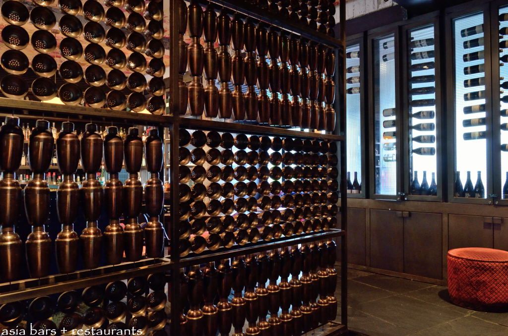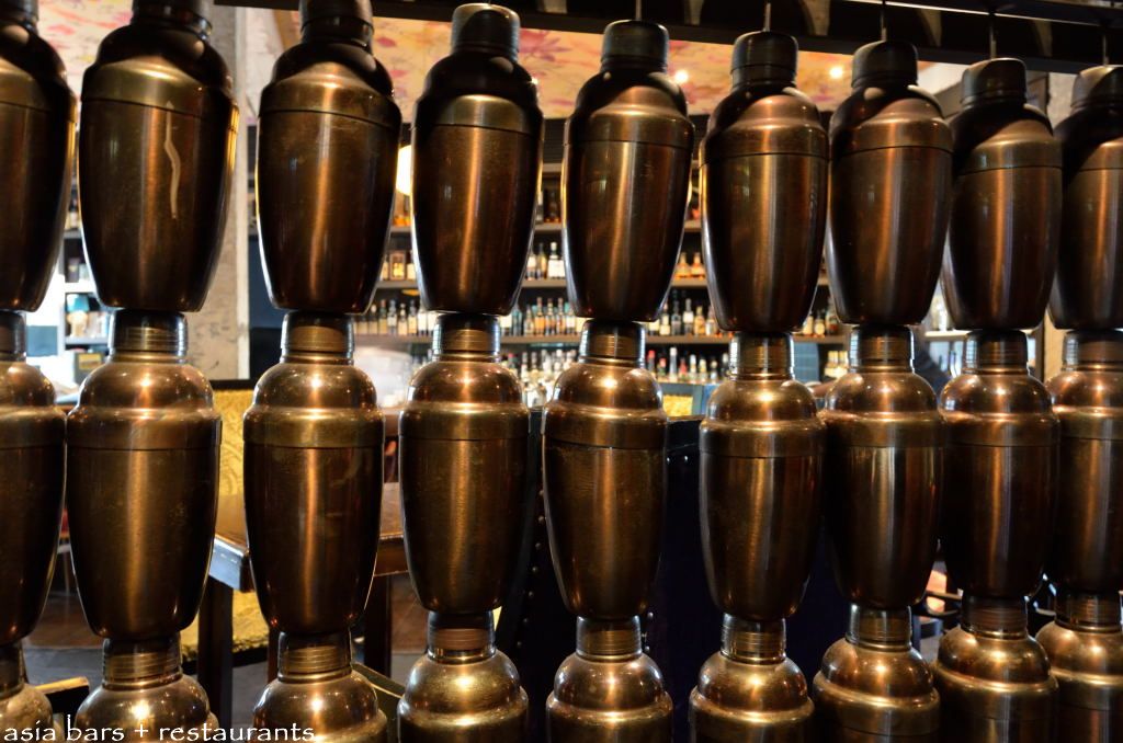 Rows of bronzed cocktail shakers separated the bar space from the entrance stairway.