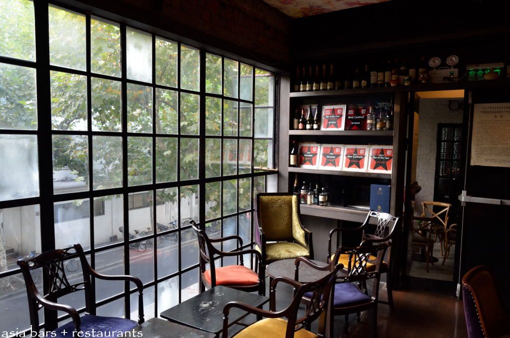 The floor to ceiling windows overlook the tree-lined roadway in the former French Concession residential area of Shanghai.